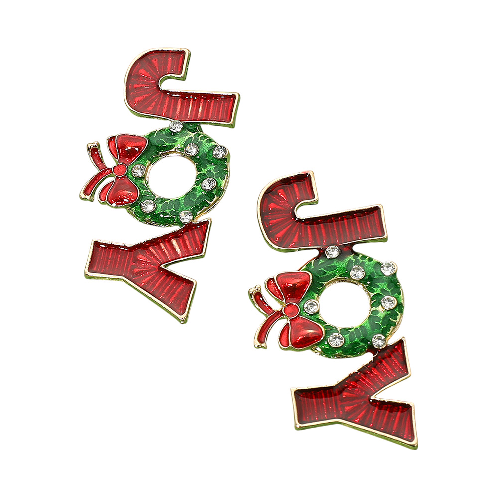 Details • Size : 1.2" X 2.25" • Post Back • Celebrate the holidays with these joyful “JOY” earrings featuring sparkling wreaths, bows, and crystal accents. Designed for festive cheer, they add a playful seasonal sparkle perfect for Christmas parties, gatherings, and gift-giving moments. • Lead and Nickel Compliant