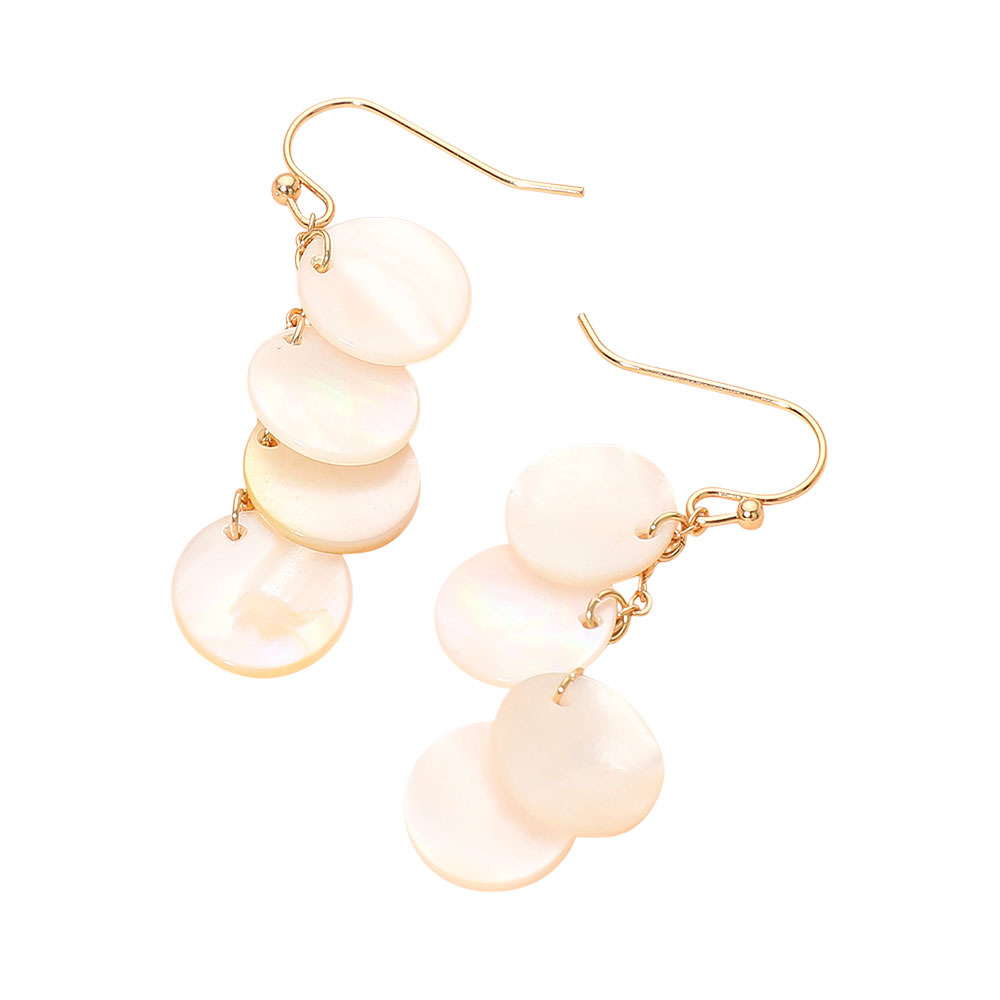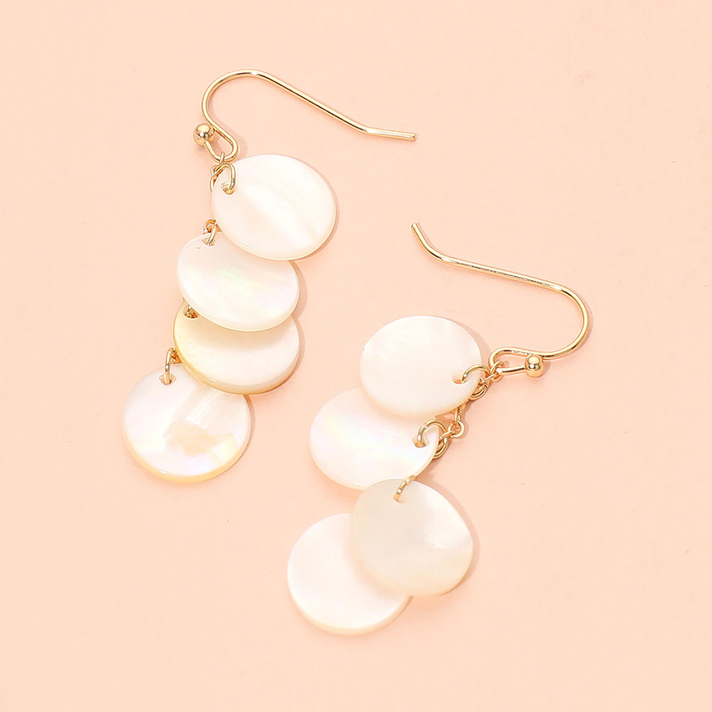 Details • Size : 0.5" X 1.8" • Fish Hook Back • Graceful drop earrings with cascading flat disc elements that catch the light with gentle movement. Designed for a refined silhouette that transitions seamlessly from daytime polish to evening elegance, adding soft shimmer and modern charm to any outfit. • Lead and Nickel Compliant