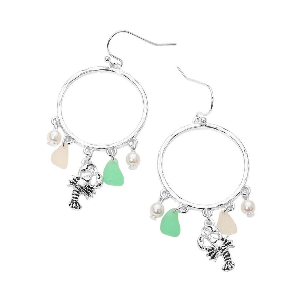 Lobster Sea Glass Charm Drop Open Ring Dangle Earrings