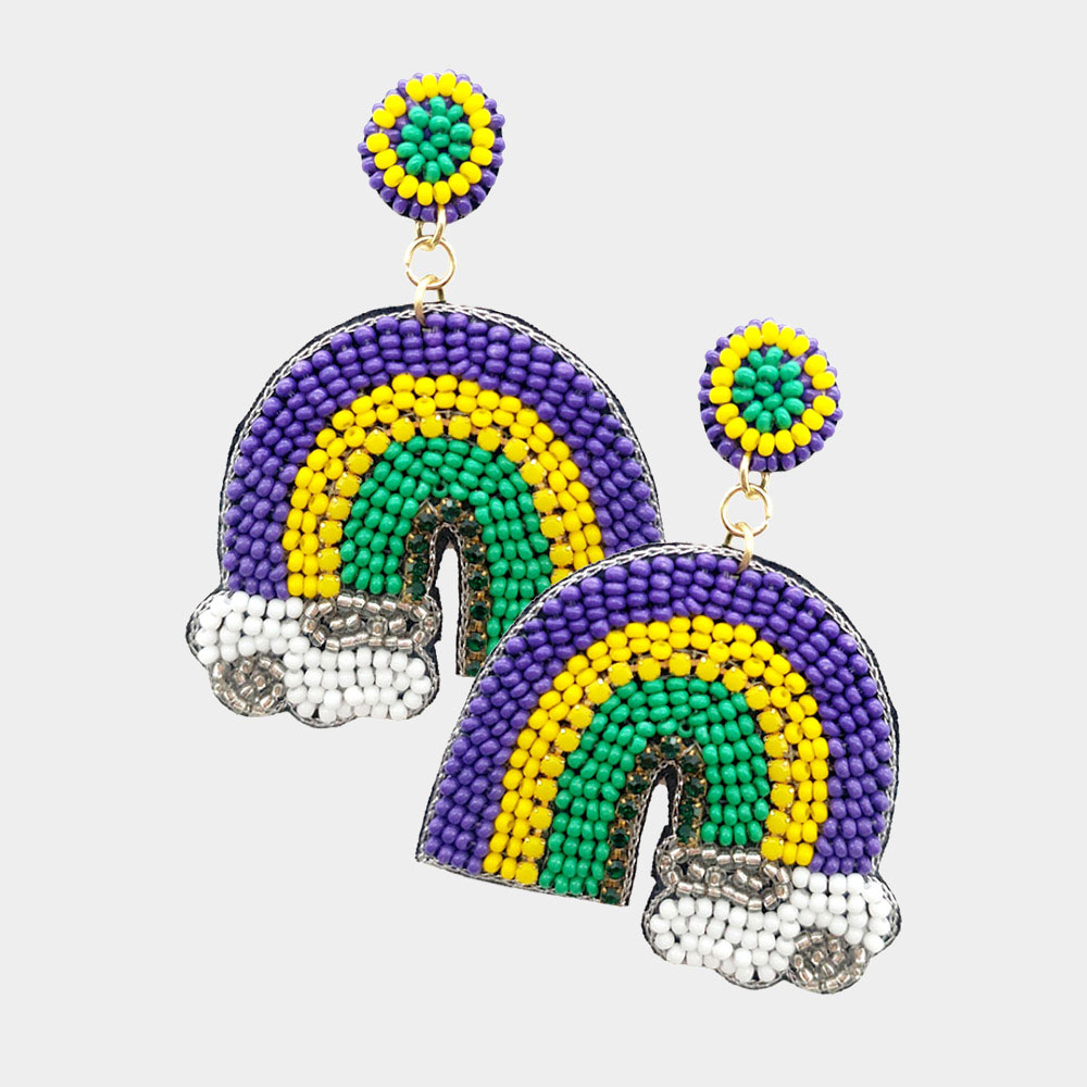 Mardi Gras Felt Back Seed Beaded Rainbow Dangle Earrings