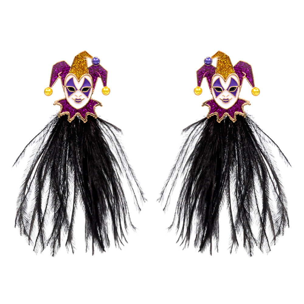 Mardi Gras Glittered Jester Pierrot Feather Earrings