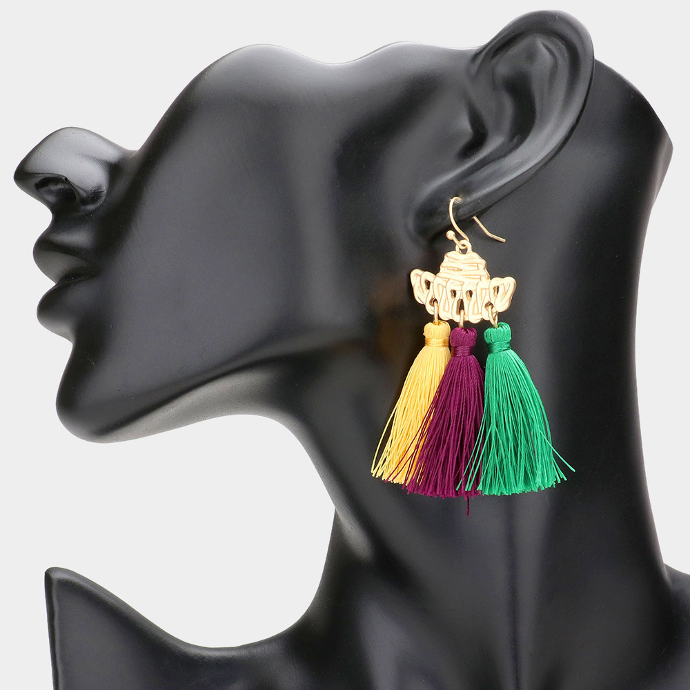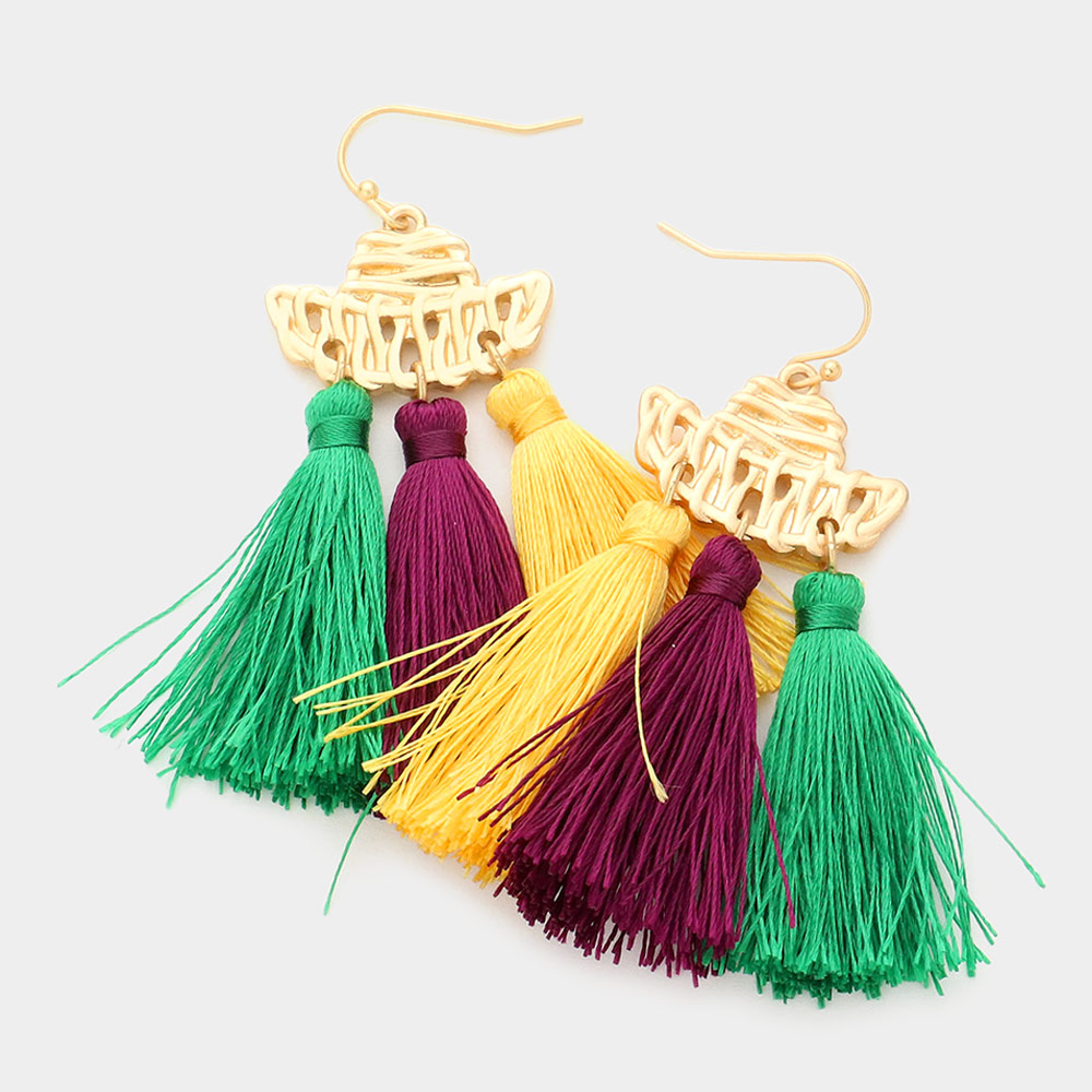 Mardi Gras Metal Hat Triple Tassel Link Dangle Earrings