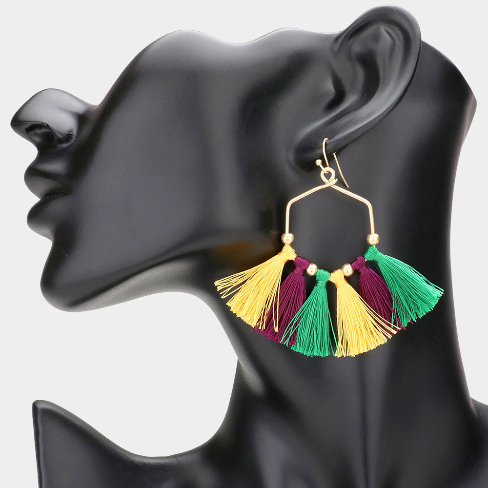 Mardi Gras Open Metal Hexagon Tassel Fringe Dangle Earrings