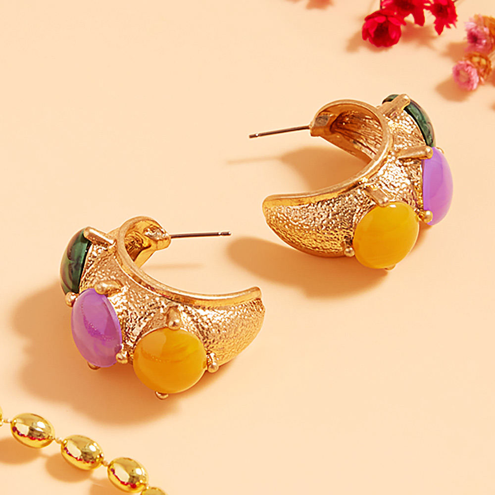 Details • Size : 1.3" X 1.3" X 0.75" • Titanium Post Back • Elevate your style with these chunky multicolor stone earrings. Set in textured gold-tone metal, each vibrant gem adds a touch of bold elegance. Perfect for making a statement at parties, events, or adding flair to everyday outfits. • Lead and Nickel Compliant • Hypoallergenic