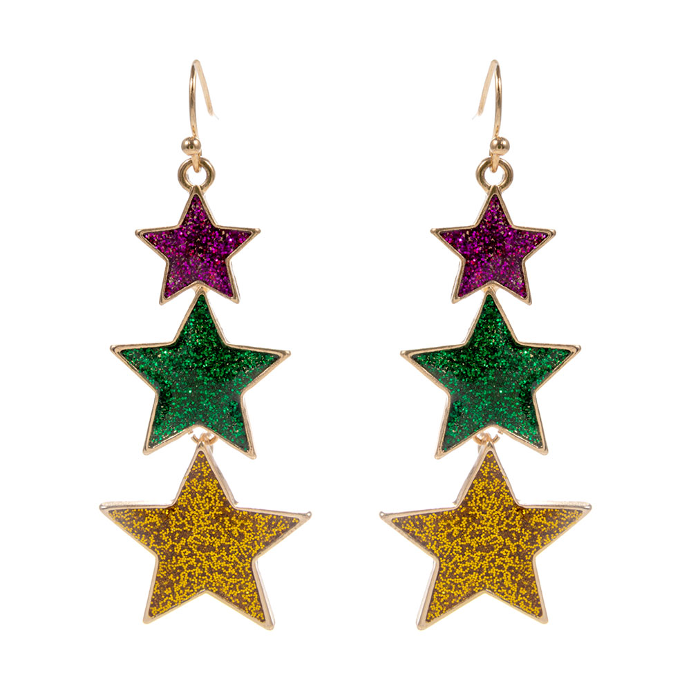 Mardi Gras Triple Glitter Star Link Drop Earrings Mardi Gras Triple Glitter Star Link Drop Earrings