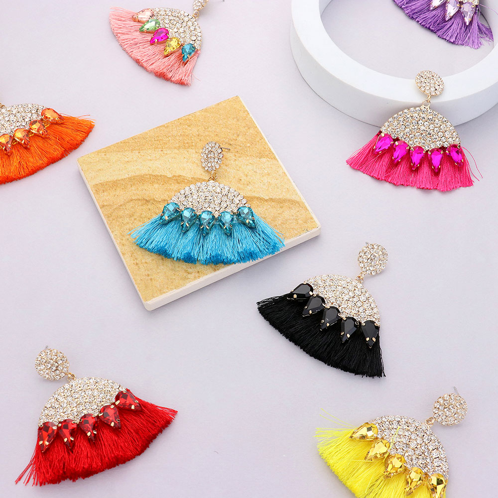 Marquise Stone Cluster Pointed Rhinestone Paved Tassel Dangle Earrings