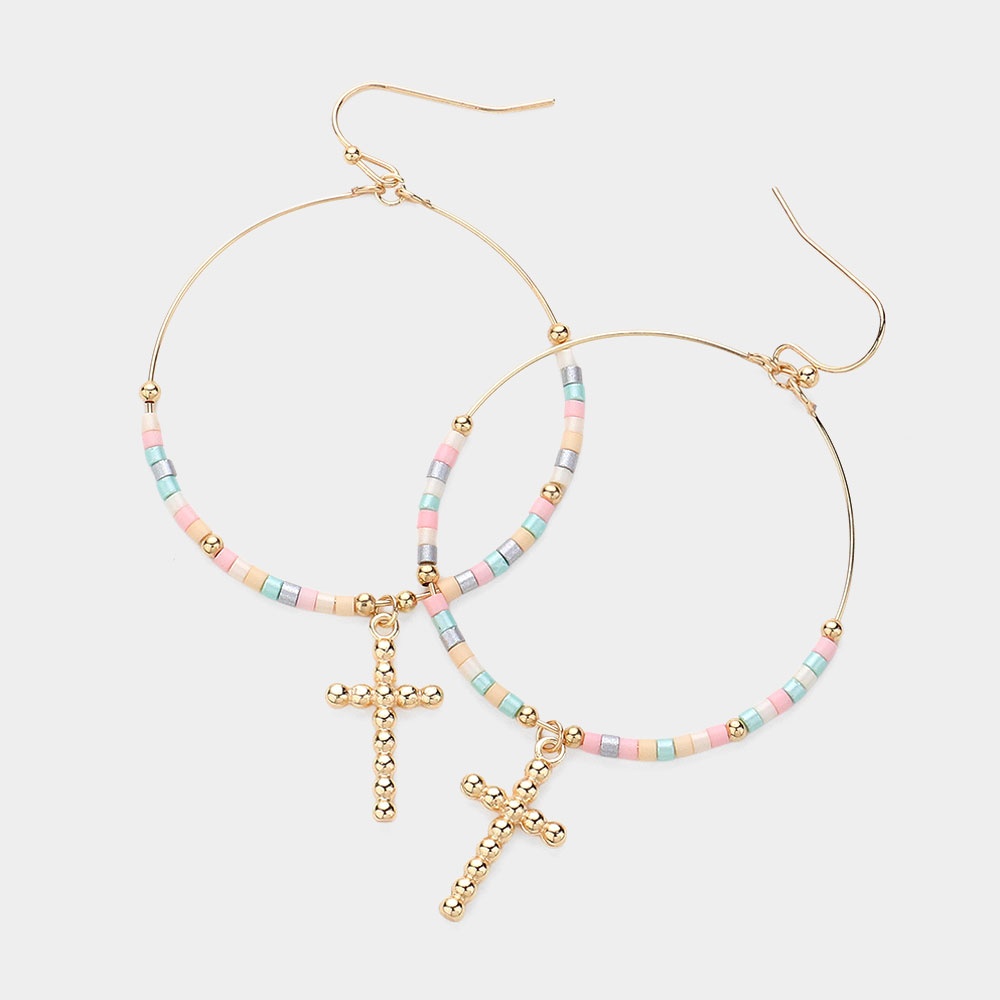 Metal Bubble Cross Charm Seed Beaded Open Wire Dangle Earrings