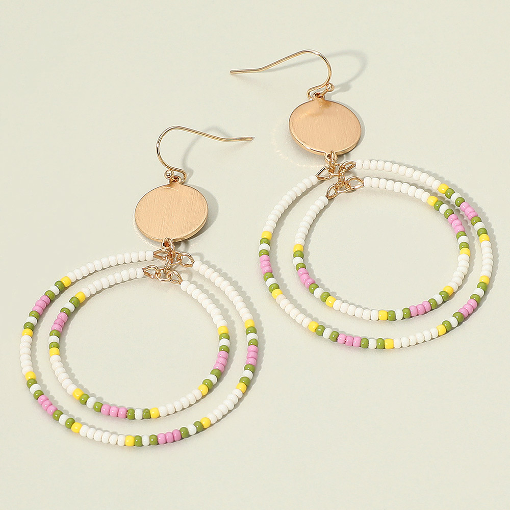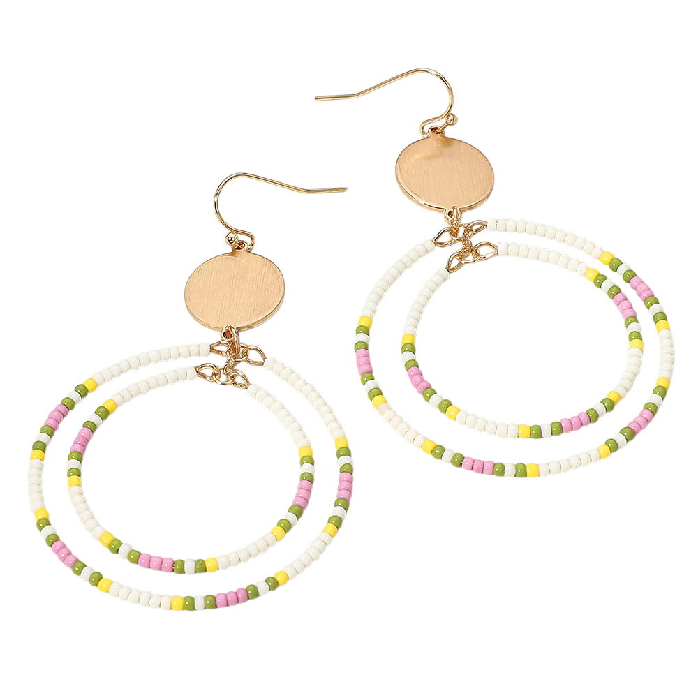 Details • Size : 1.75" X 3" • Fish Hook Back • Elevate your look with these double hoop beaded earrings featuring layered detailing and a sleek round disc accent. Lightweight and trendy, they offer a playful yet elegant design perfect for casual wear, summer outfits, or adding a unique touch to special occasion styles. • Lead and Nickel Compliant