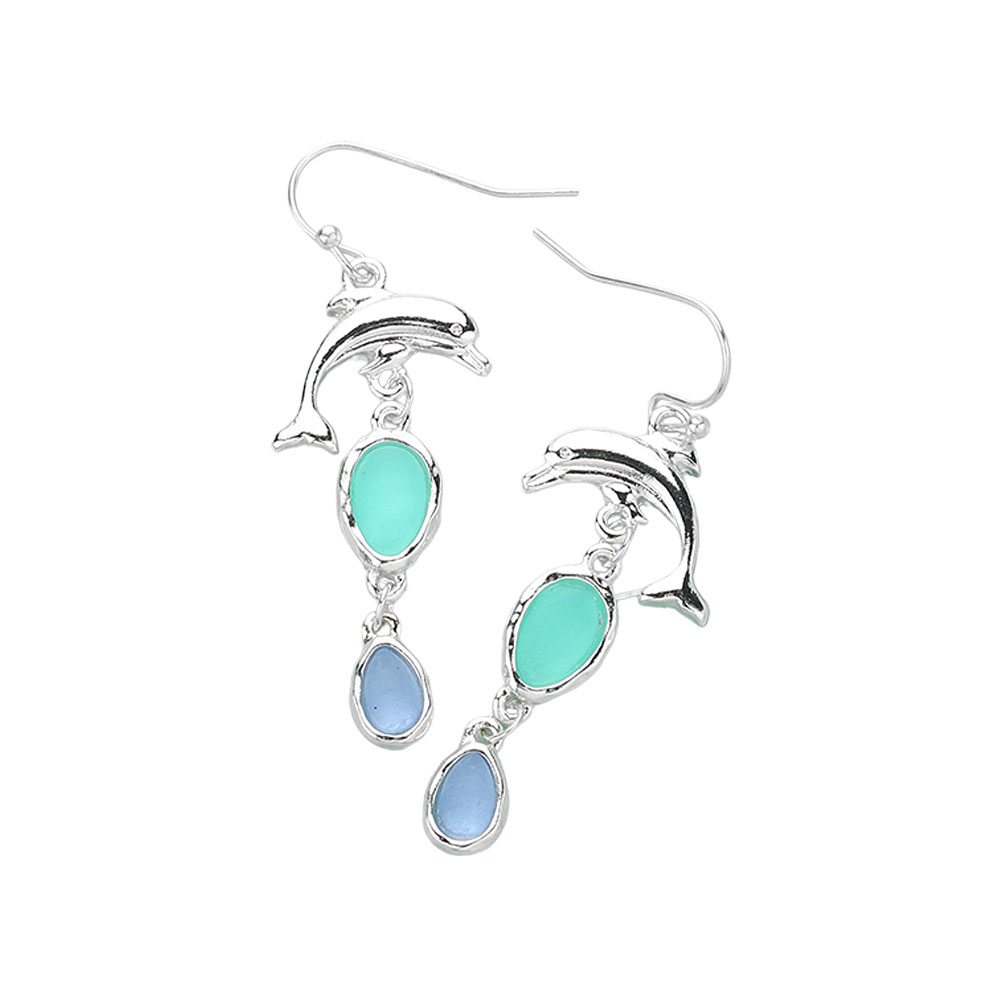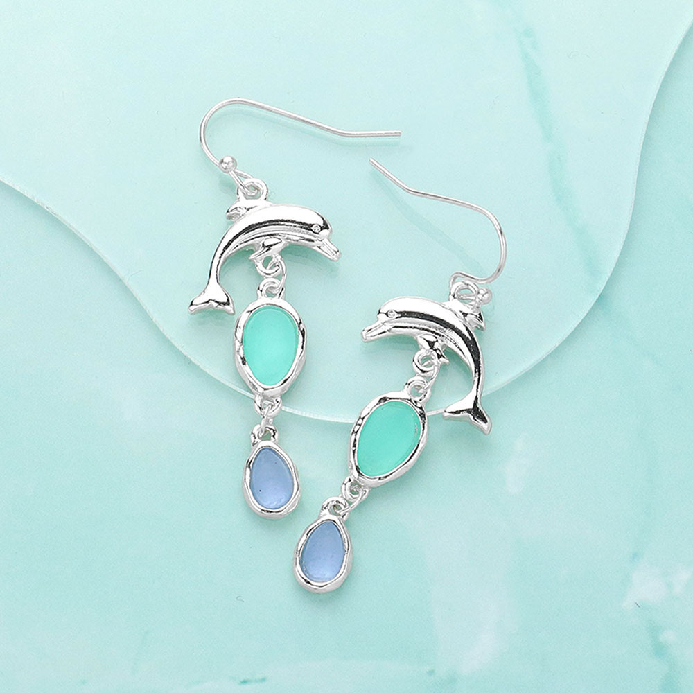 Details • Size : 0.7" X 2.1" • Fish Hook Back • Charming dolphin dangle earrings accented with ocean-inspired drop details in soft hues. A playful accessory perfect for summer, beach outings, or seaside fashion. Lightweight and stylish, these earrings bring coastal vibes and whimsical charm, making them a fun statement piece for any ocean lover. • Lead and Nickel Compliant