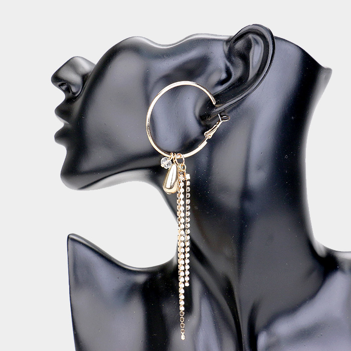 Metal Flower Rhinestone Pave Tassel Hoop Earrings