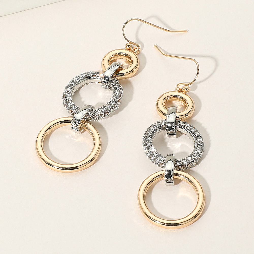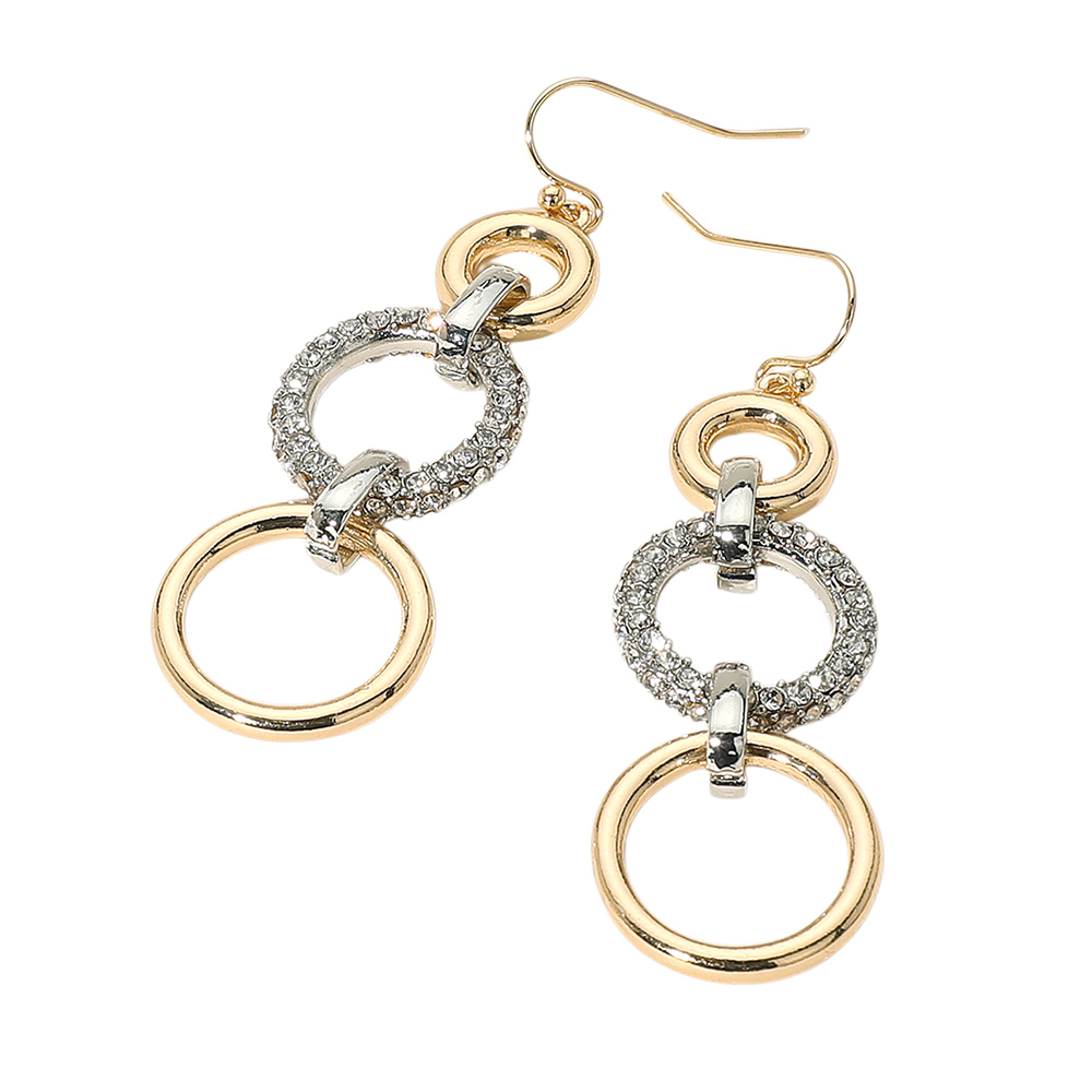 Metal Two Tone Stone Paved Triple Ring Link Drop Earrings