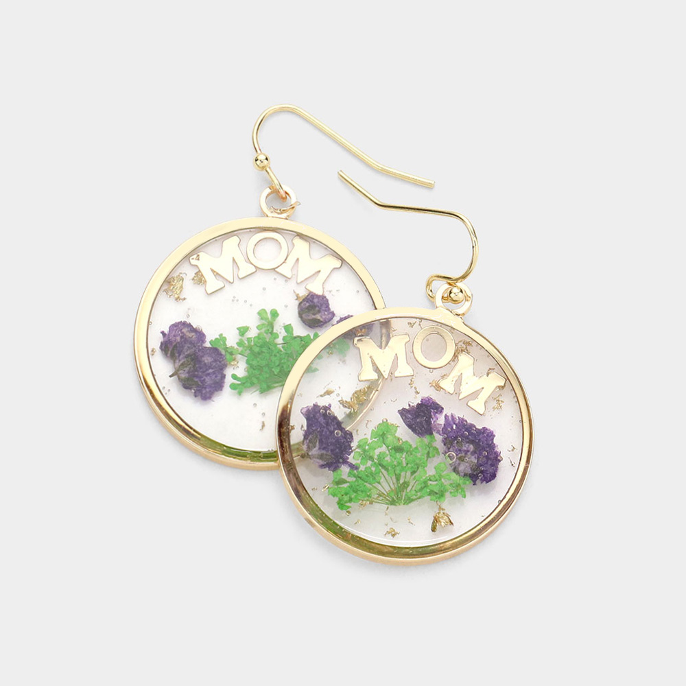MOM Pressed Flower Clear Lucite Round Dangle Earrings