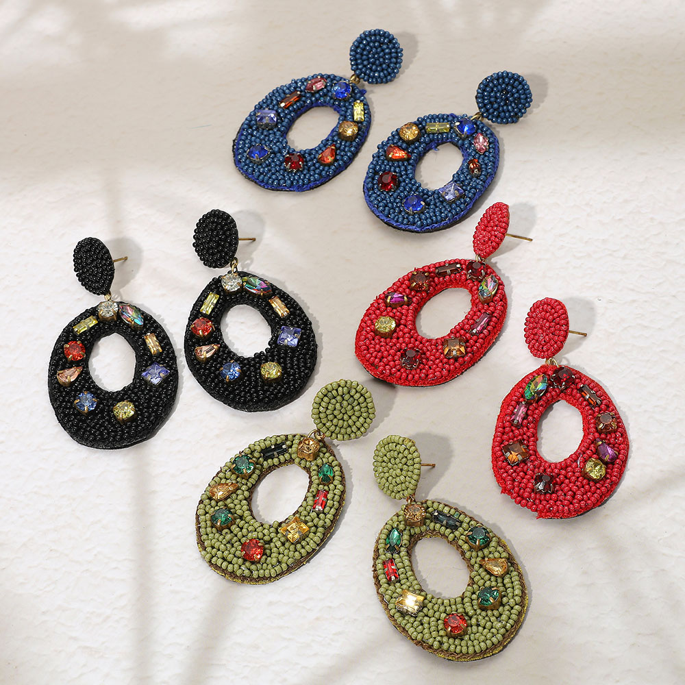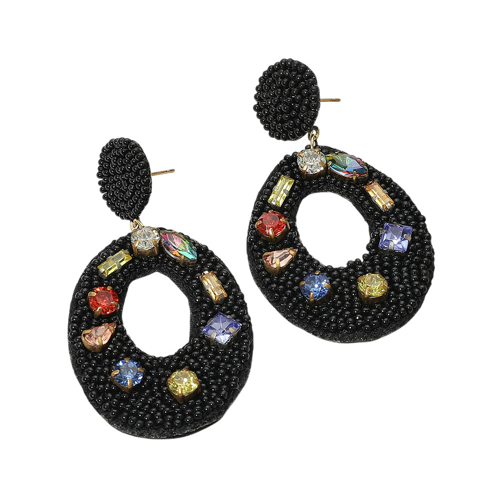 Multi Stone Embellished Seed Beaded Cutout Oval Dangle Earrings