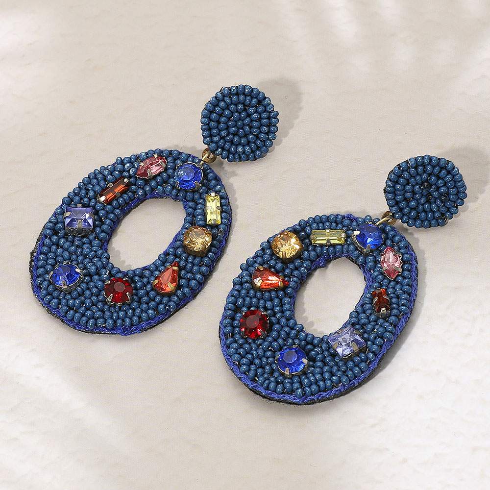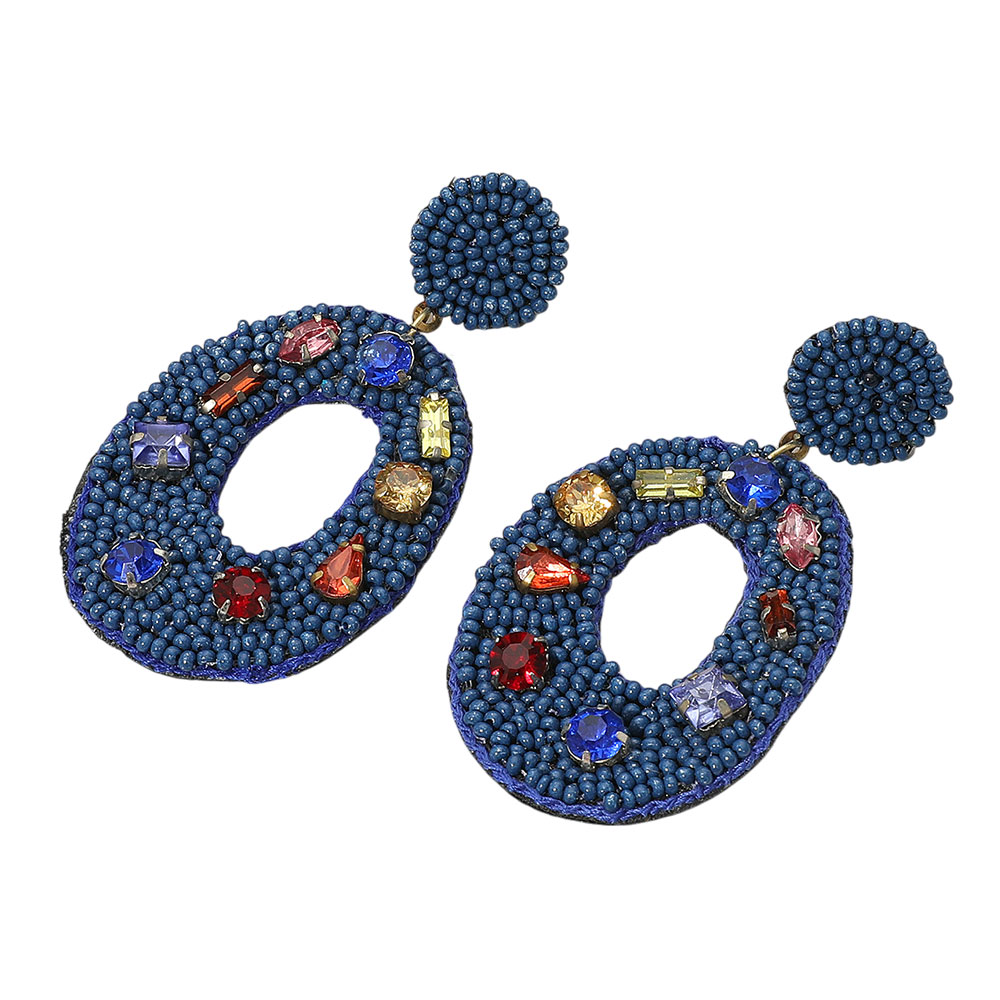 Multi Stone Embellished Seed Beaded Cutout Oval Dangle Earrings