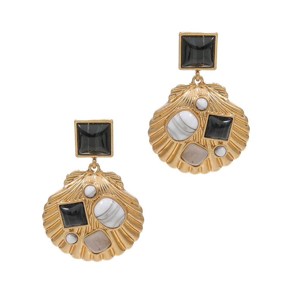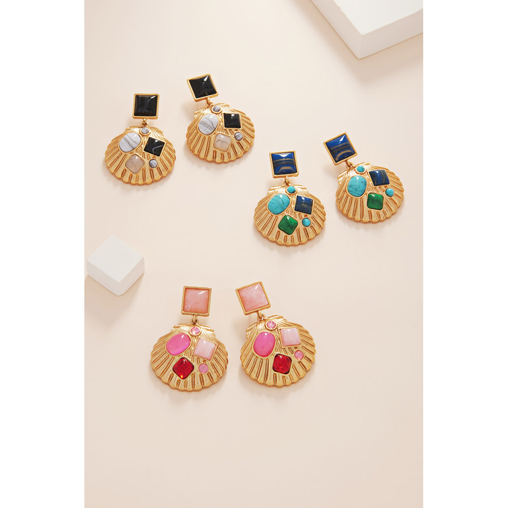 • Elegant shell-shaped drop earrings in gold tone, embellished with marbled and solid stone accents for a chic, earthy look. A stylish accessory to elevate everyday wear or complement coastal-inspired outfits.