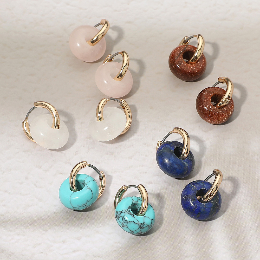• A versatile collection of mini hoop earrings accented with smooth stone charms in assorted finishes. Each pair features a polished gold-tone huggie-style hoop with a hinged closure for easy, secure wear. From soft rose and frosted white to bold turquoise, lapis, and golden brown, these earrings offer a perfect mix of everyday neutrals and statement tones. Lightweight, comfortable, and ideal for layering or gifting.