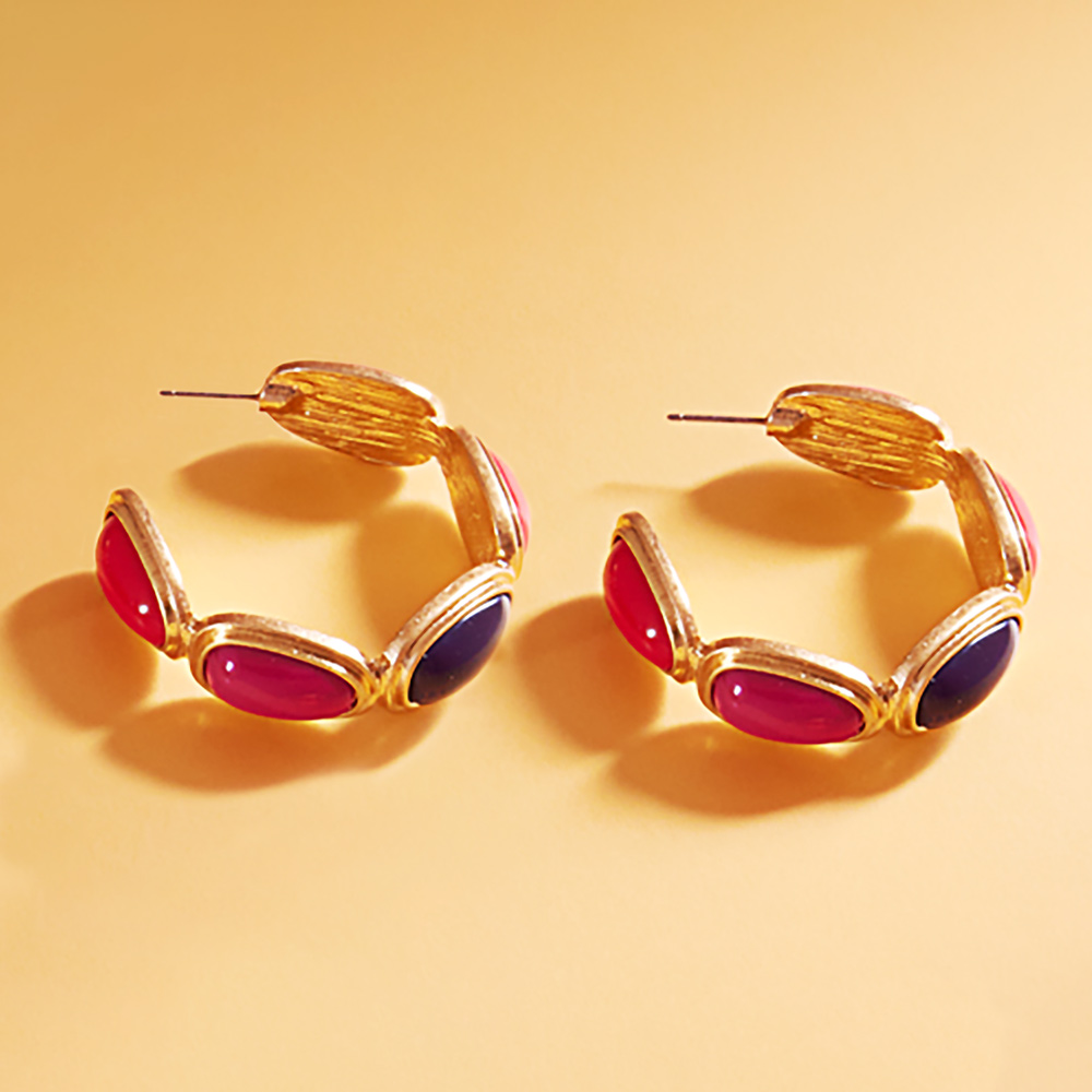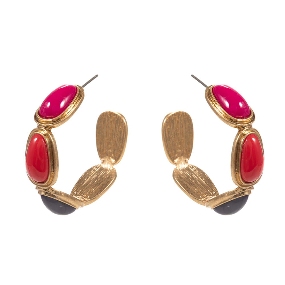 Details • Size : 1.75" X 1.75" • Titanium Post Back • Make a statement with these multicolor stone hoop earrings. Featuring vibrant gemstone accents in a bold gold-tone setting, these hoops bring playful elegance to any outfit. Perfect for adding color and charm to your casual or festive look. • Lead and Nickel Compliant • Hypoallergenic