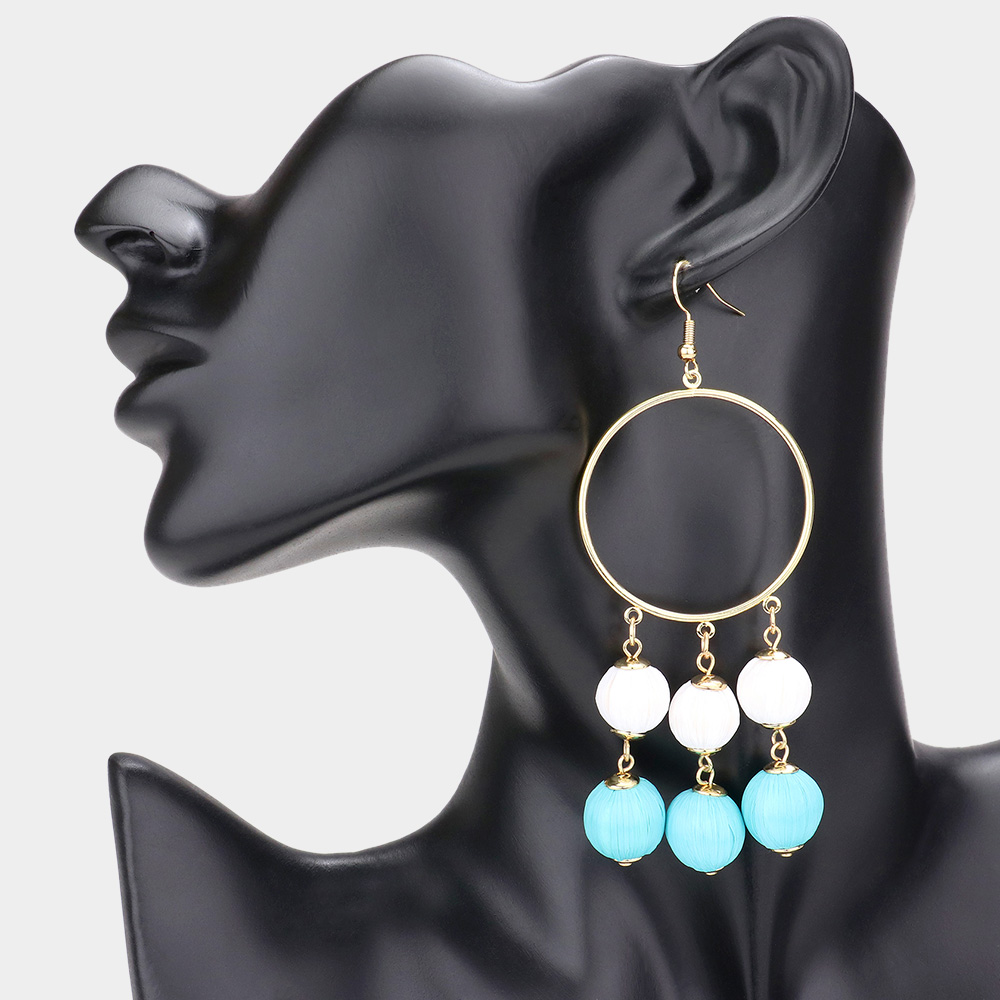 Open Metal Circle Raffia Wrapped Ball Link Dangle Earrings