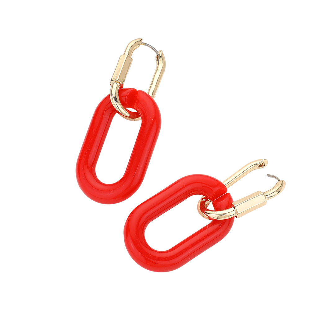 • These geometric link drop earrings feature a bold, modern design with a sleek hoop detail and vibrant linked shape. Lightweight and stylish, they add a contemporary pop to any look, making them perfect for both casual outfits and statement accessorizing.