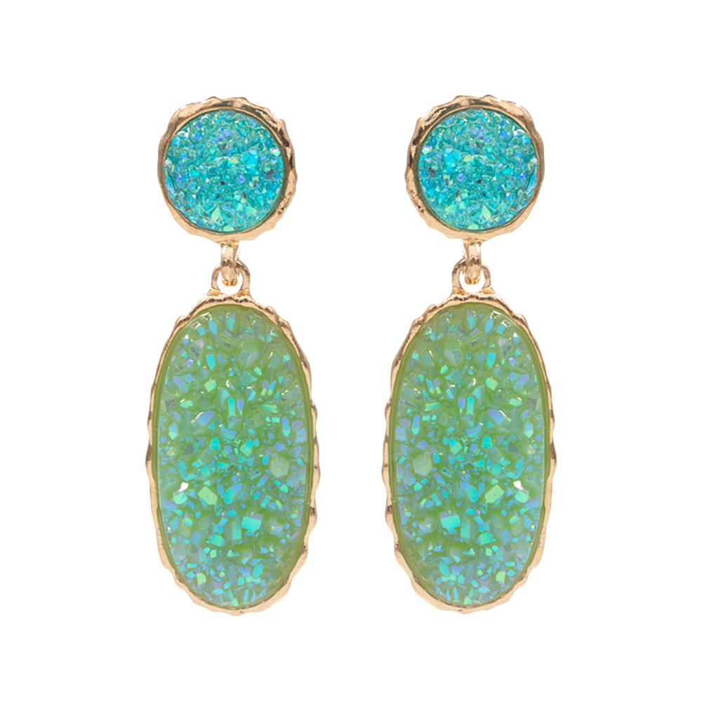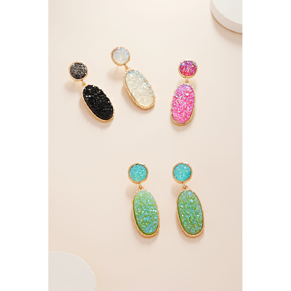 Details • Size : 0.6" X 1.75" • Titanium Post Back • Bold dangle earrings featuring round and oval sparkling stones in a sleek drop design. Perfect for special occasions or adding a striking accent to your outfit with refined shimmer and charm. • Hypoallergenic • Lead and Nickel Compliant