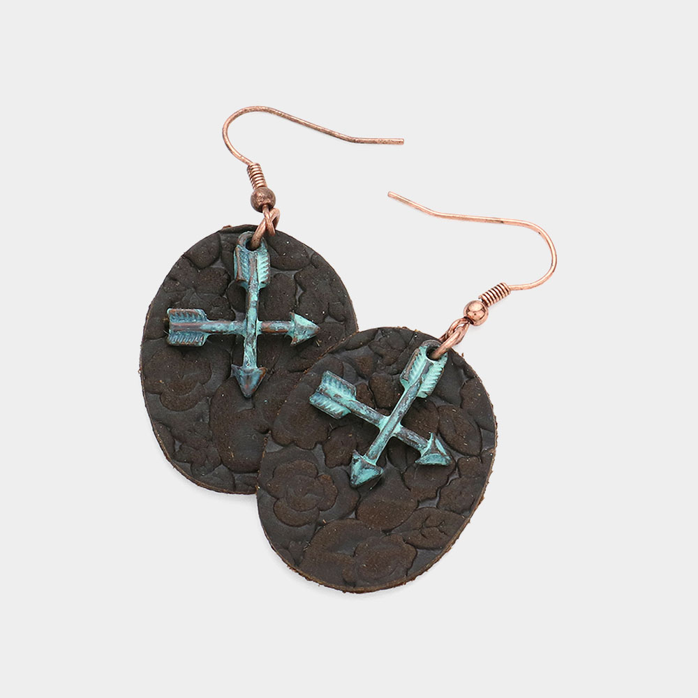 Oval Faux Leather Metal Arrow Dangle Earrings