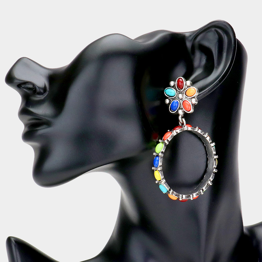 Oval Natural Stone Embellished Open Circle Dangle Earrings