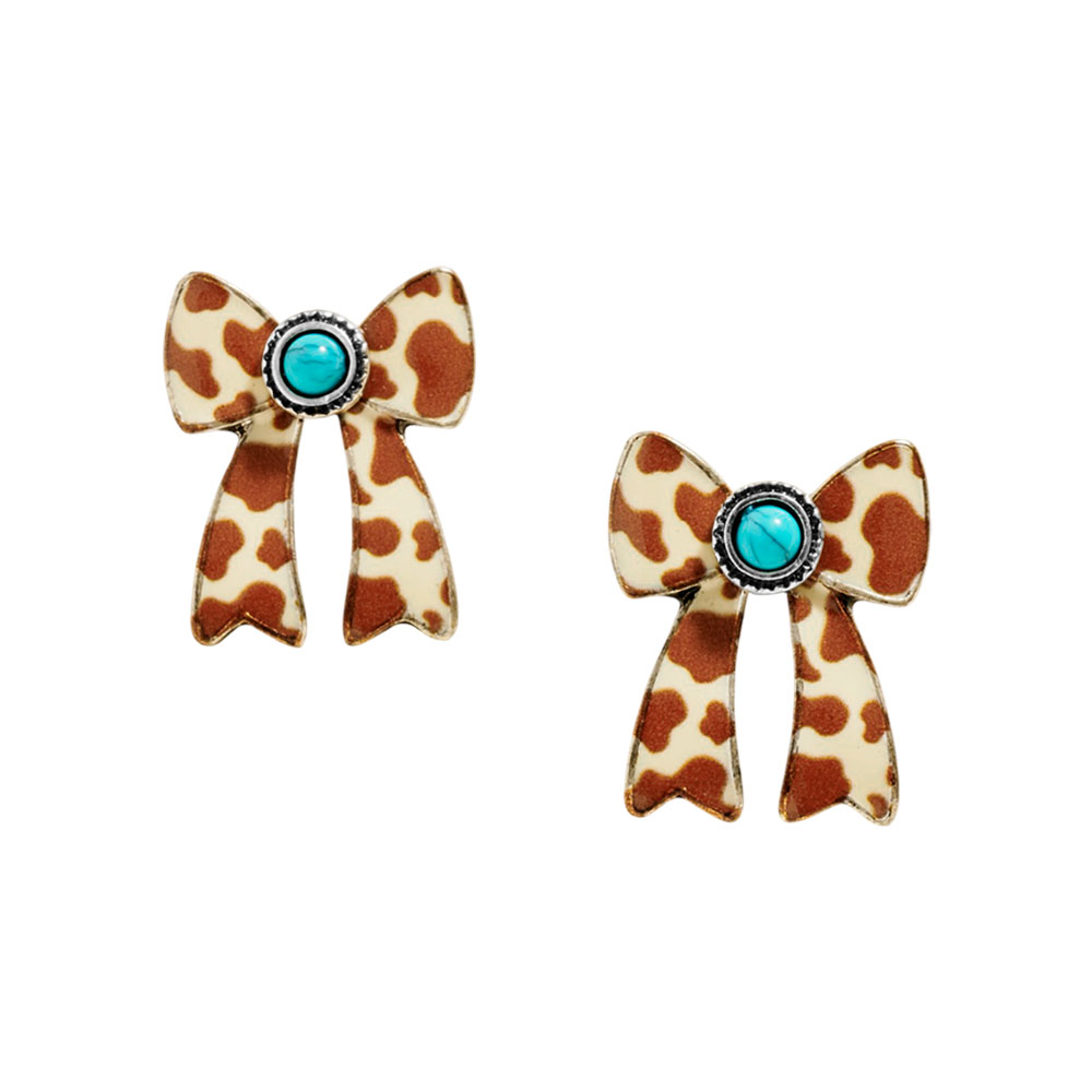 Oval Turquoise Stone Center Animal Pattern Print Western Bow Earrings