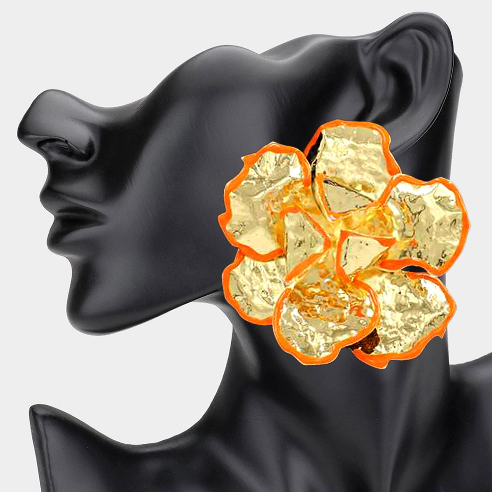 Oversized Enamel Painted Rim Hammered Metal Flower Earrings