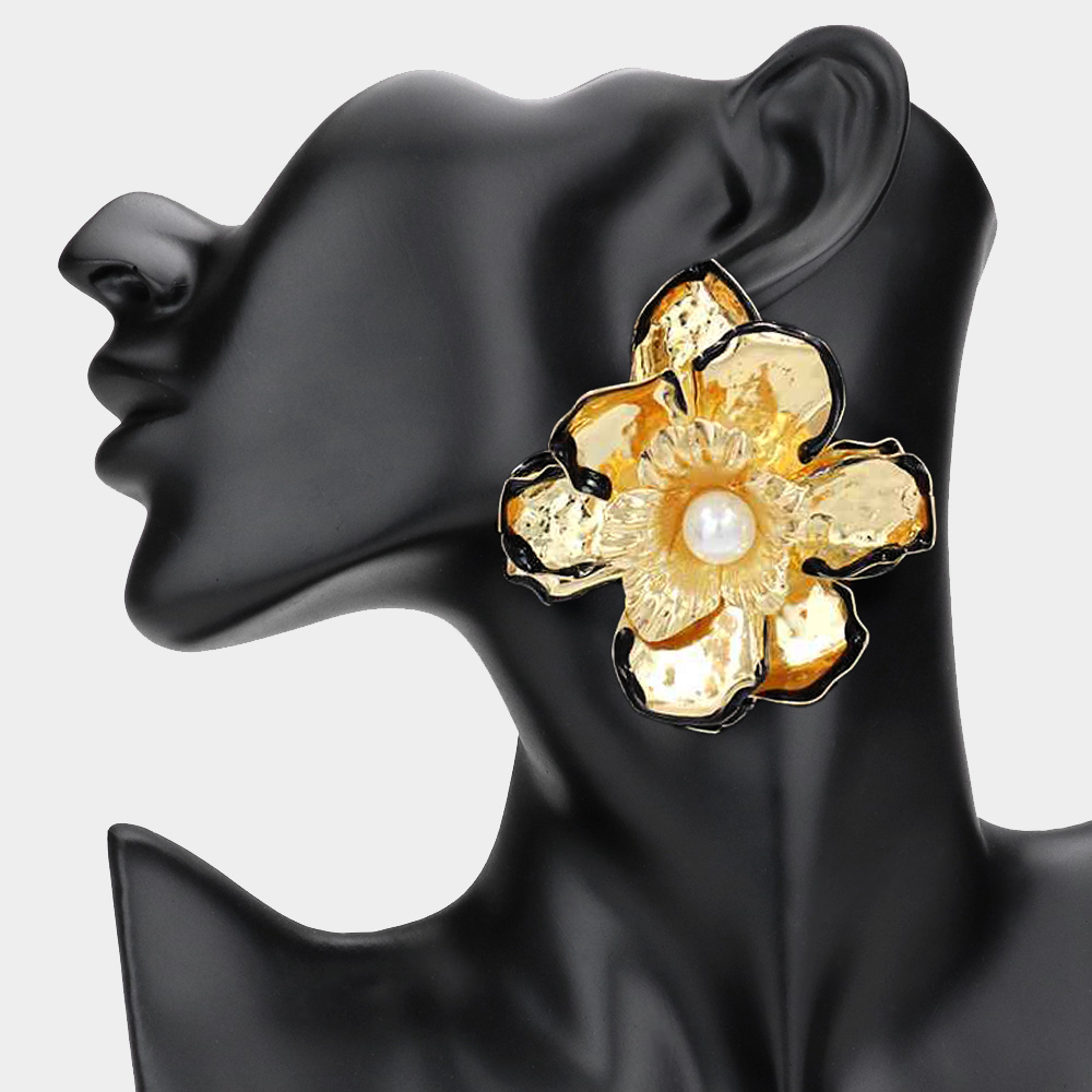 Details • Size : 2.6" X 2.5" • Post Back • Elevate your look with these floral oversized statement earrings featuring a bold petal design and pearl center accent. Perfect for parties, vacations, or evening wear, these earrings add glamour and elegance to any outfit, making them a standout addition to your jewelry collection. • Lead and Nickel Compliant