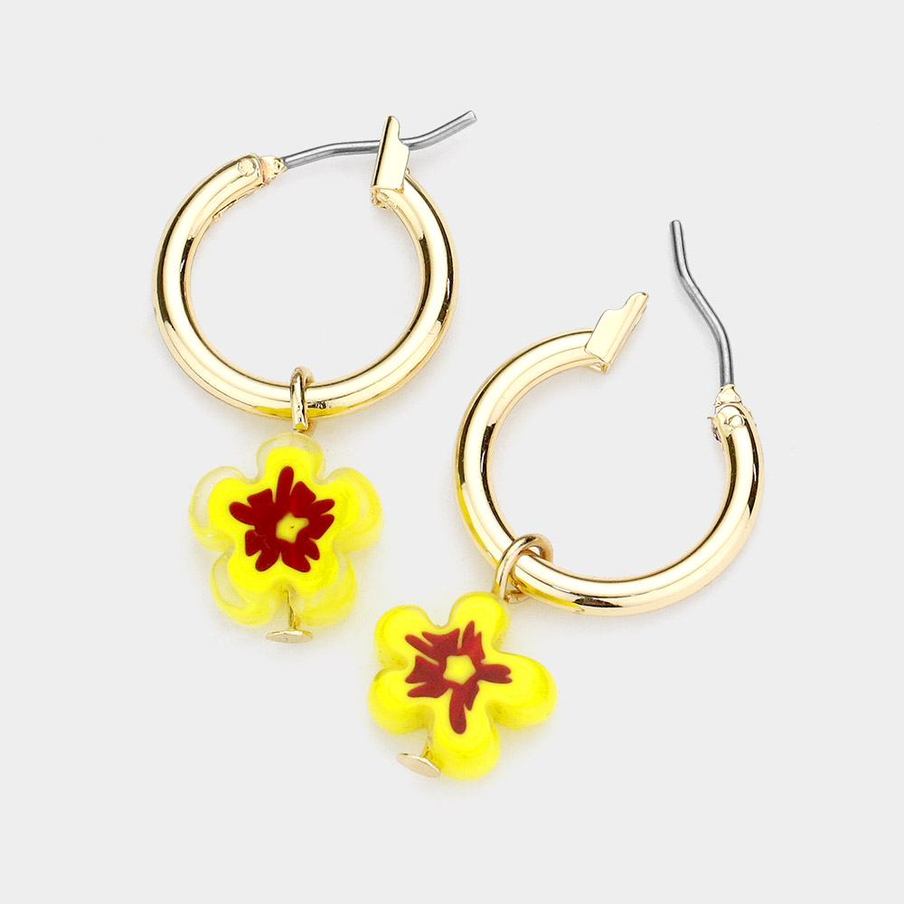 Patterned Flower Dangle Metal Hoop Pin Catch Earrings