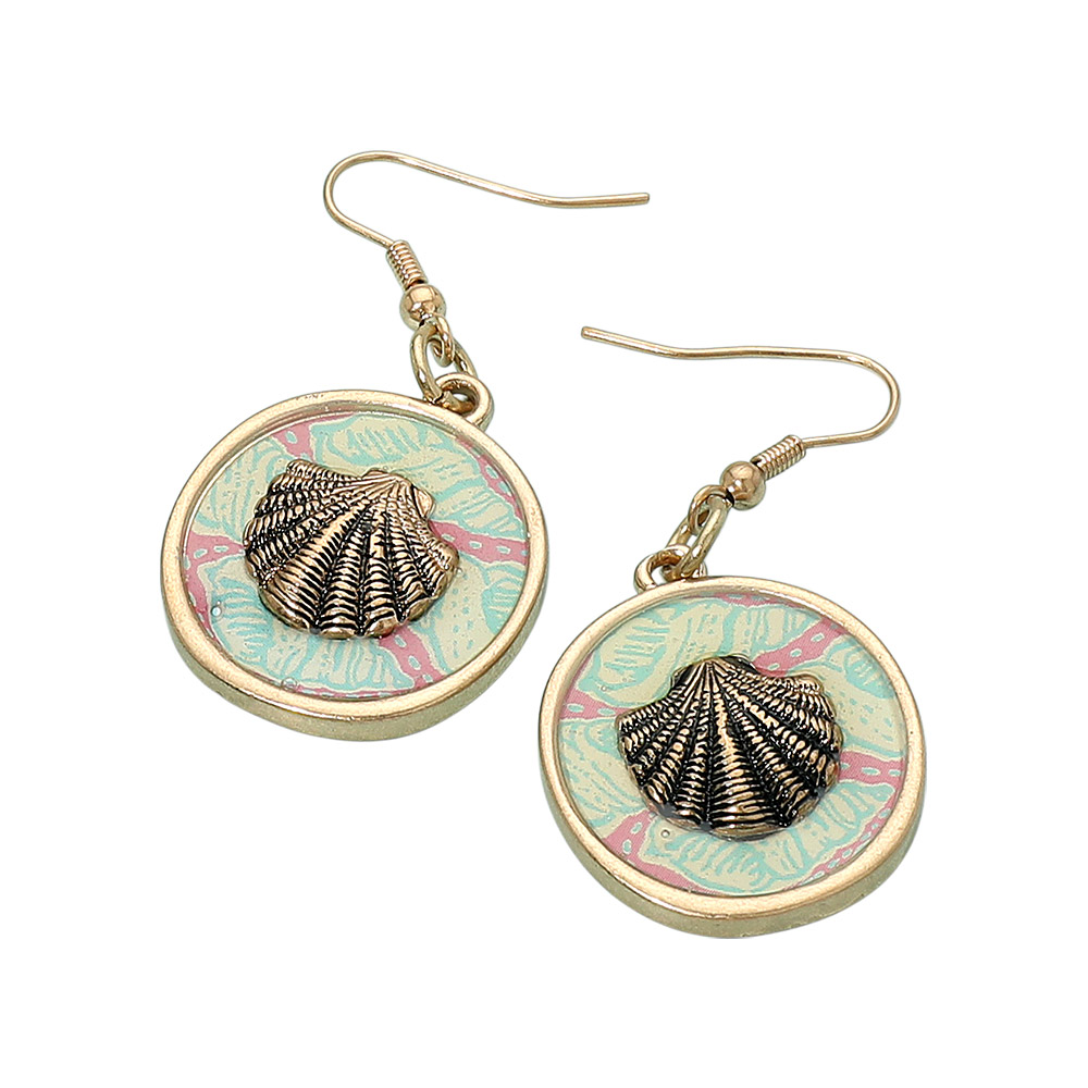 Details • Size : 1" X 1.75" • Fish Hook Back • Charming round dangle earrings featuring a textured shell motif on a decorative background. Lightweight and beach-inspired, perfect for adding a coastal touch to any casual or vacation look. • Lead and Nickel Compliant