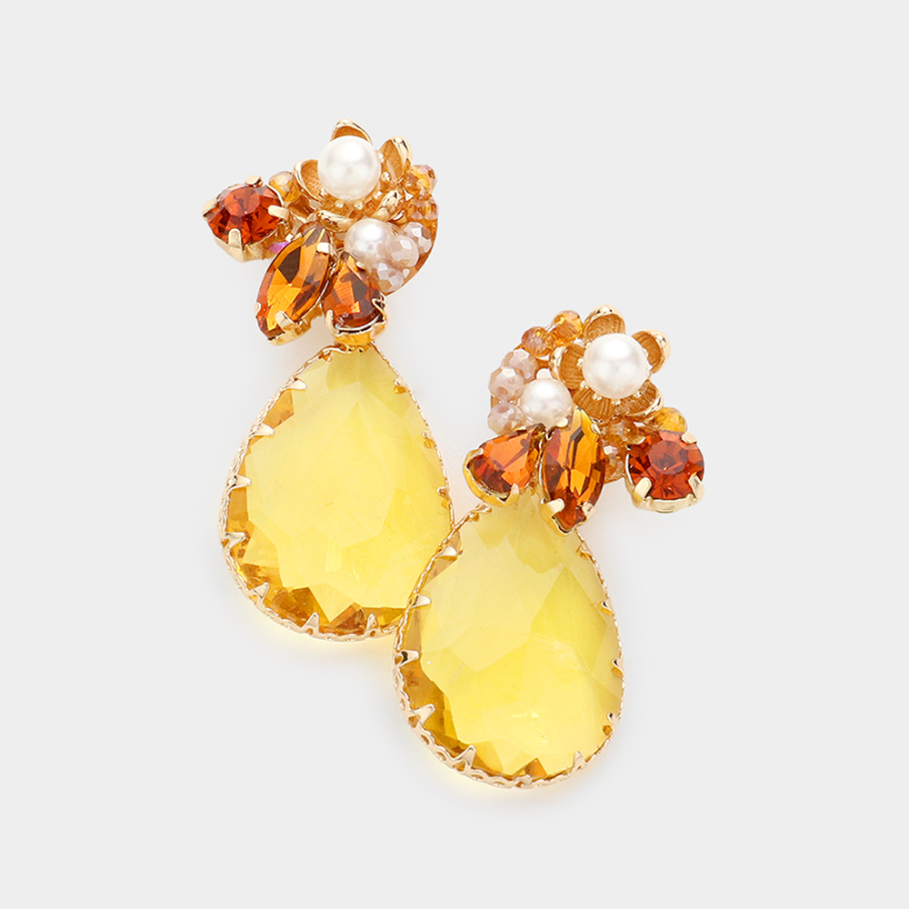 Pearl Centered Flower Teardrop Stone Link Dangle Earrings