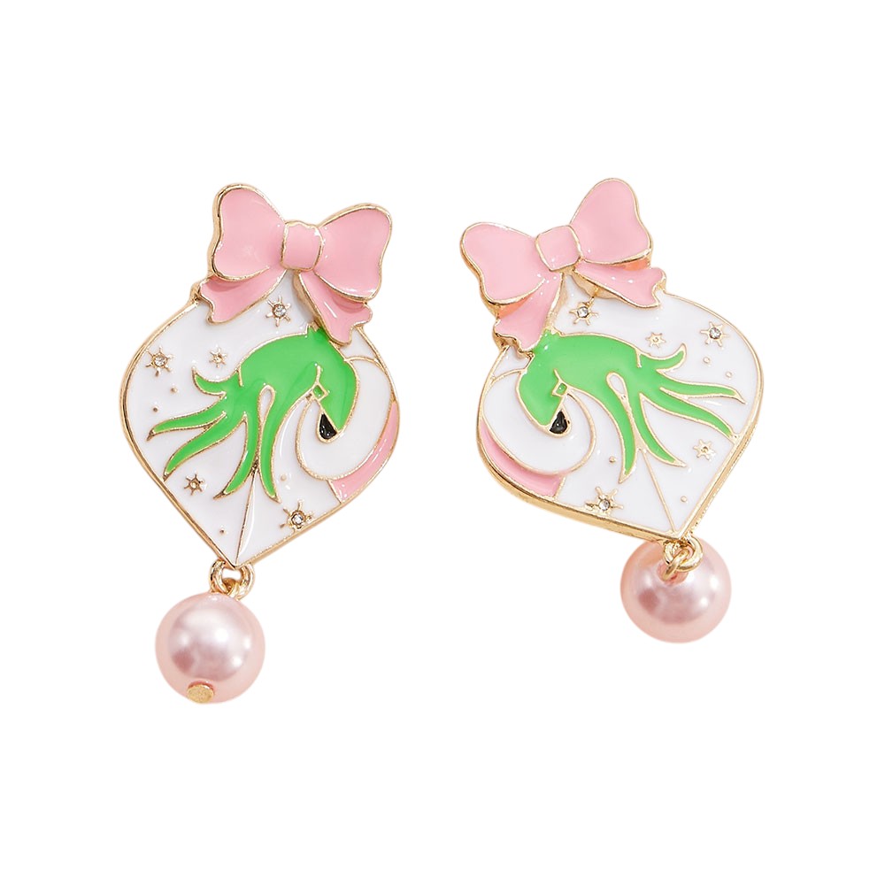 • Celebrate the holidays with these whimsical Green Monster-themed earrings shaped like festive ornaments, topped with bows and accented with dangling pearls. A fun and charming addition to your seasonal look or a great gift for anyone who loves playful holiday style.