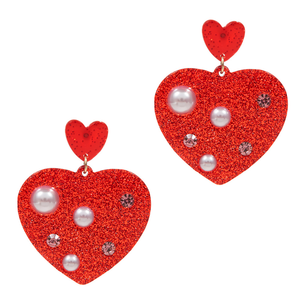 Pearl Embellished Glittered Resin Heart Dangle Earrings