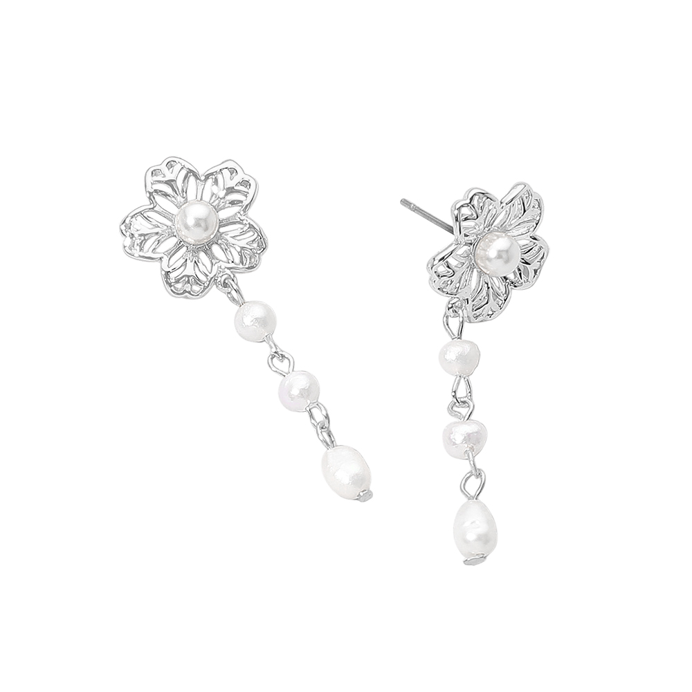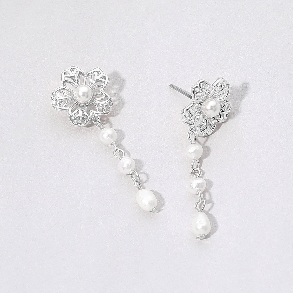 Details • Size : 0.5" X 1.5" • Post Back • Stylish floral drop earrings featuring a delicate flower design with cascading bead accents. Perfect for adding a feminine touch to both everyday looks and special events, these earrings bring elegance and charm to any jewelry collection. • Lead and Nickel Compliant • Brass