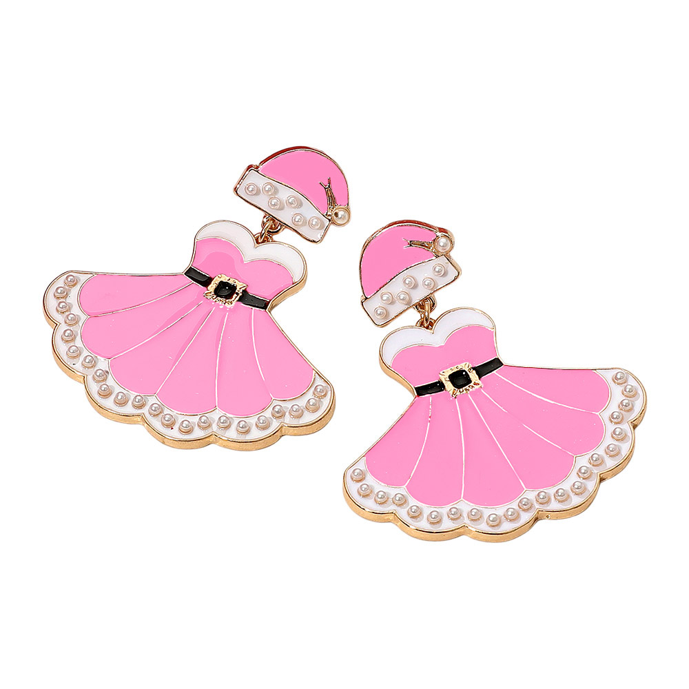 Details • Size : 1.6" X 2" • Post Back • Whimsical holiday earrings featuring glittery dress and hat designs with pearl accents. Perfect for festive events and parties. Crafted from alloy, acrylic, and enamel for a playful seasonal accessory. • Lead and Nickel Compliant