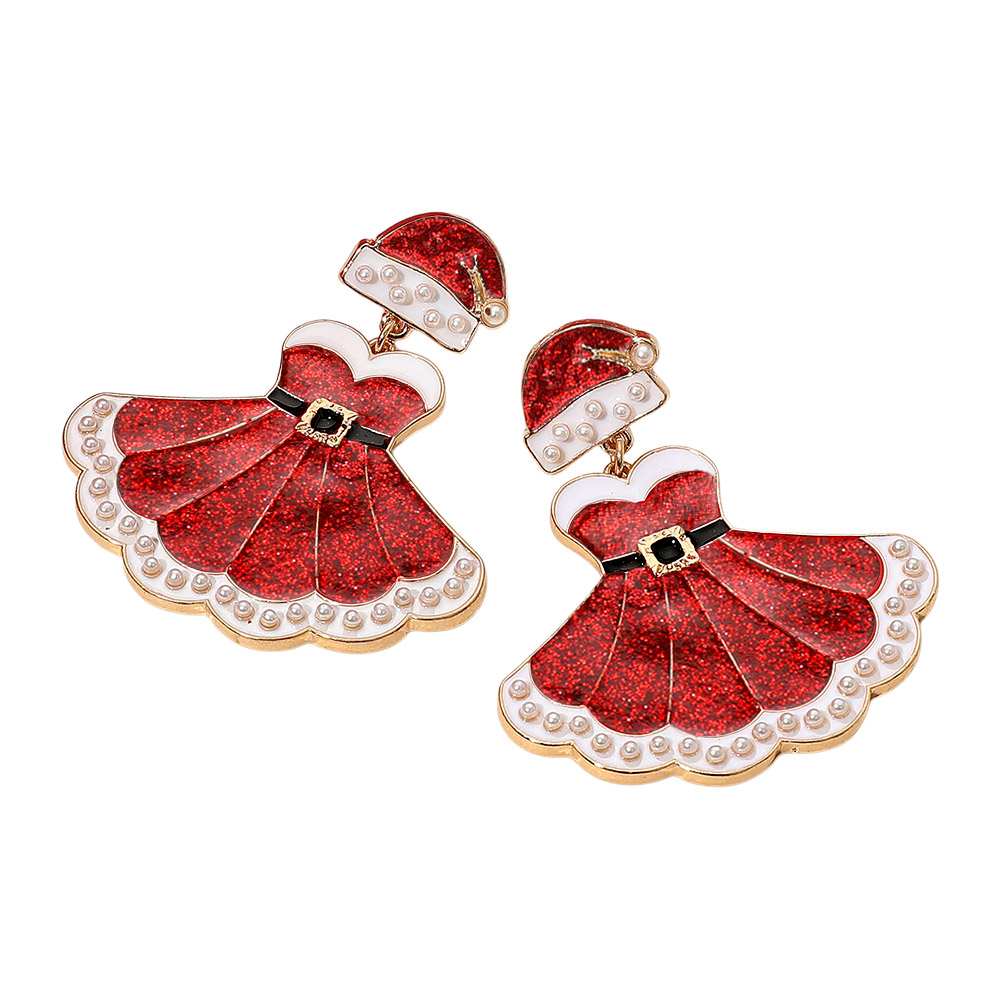 Details • Size : 1.6" X 2" • Post Back • Whimsical holiday earrings featuring glittery dress and hat designs with pearl accents. Perfect for festive events and parties. Crafted from alloy, acrylic, and enamel for a playful seasonal accessory. • Lead and Nickel Compliant