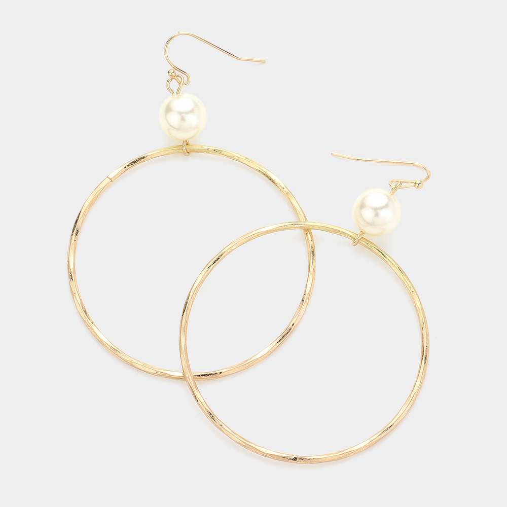 Pearl Pointed Hammered Open Metal Ring Dangle Earrings