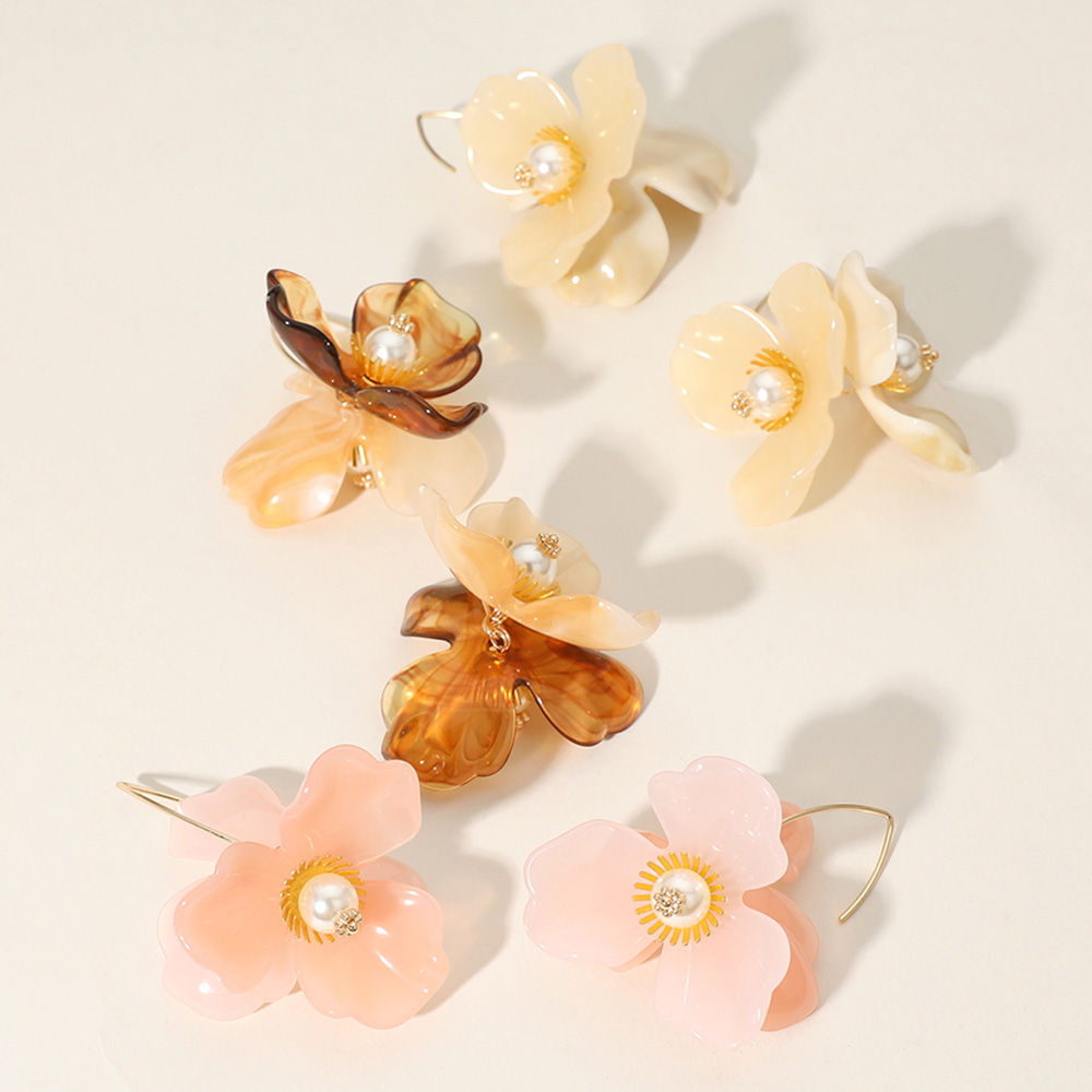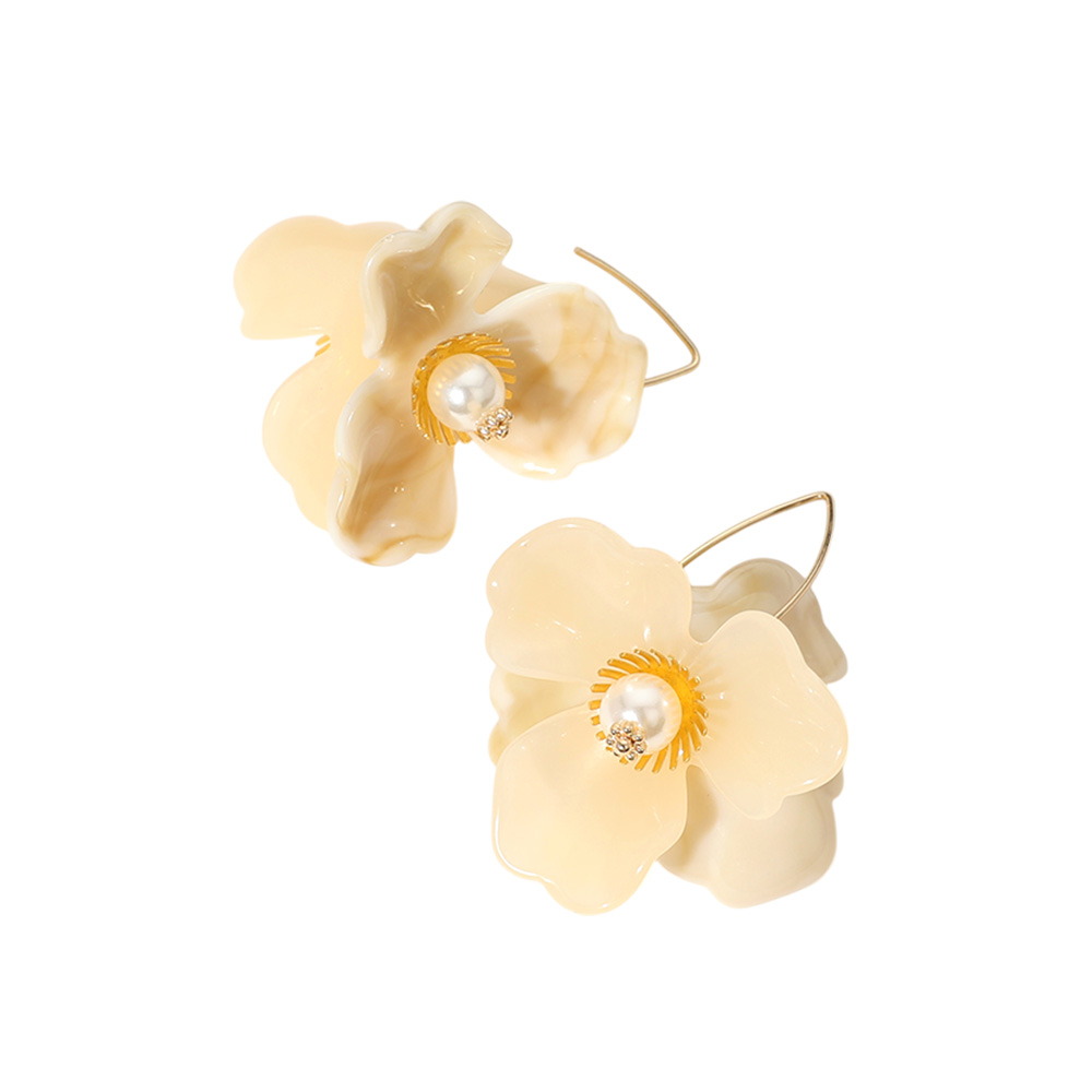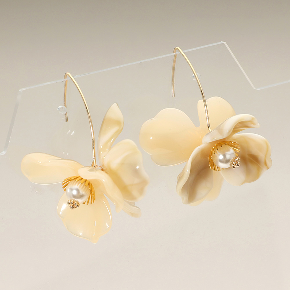 Details • Size : 2" X 2.25" • Long Hook Back • Delicate floral drop earrings featuring a blooming flower shape accented with a central bead detail. Lightweight and feminine, these earrings are perfect for casual wear, weddings, or special occasions. A romantic accessory that brings charm and elegance to any jewelry collection. • Lead and Nickel Compliant