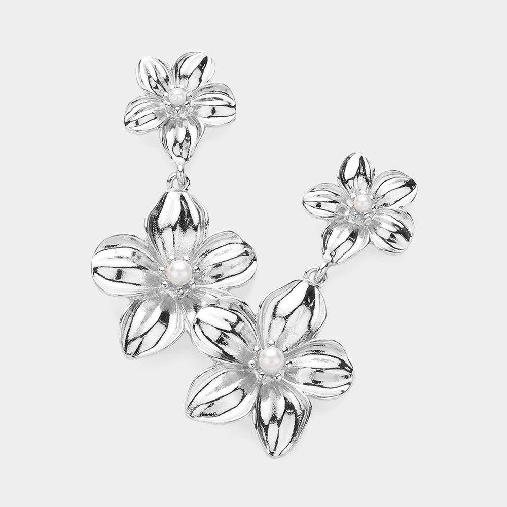 Pearl Pointed Textured Metal Flower Dangle Earrings