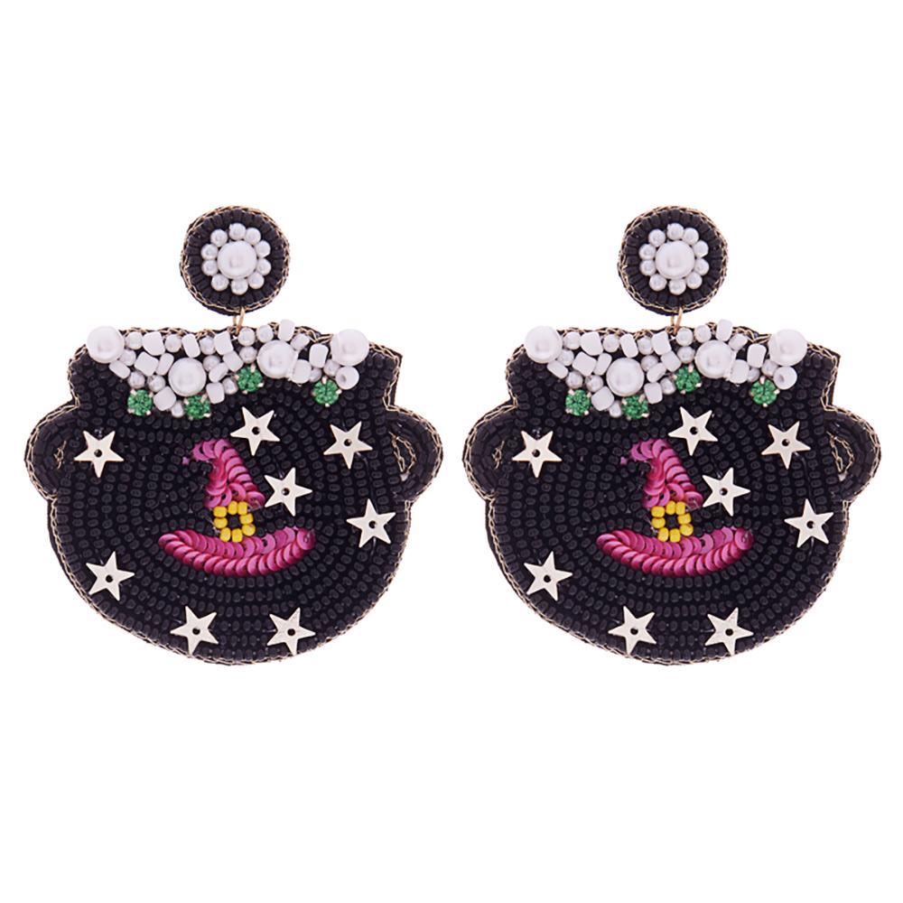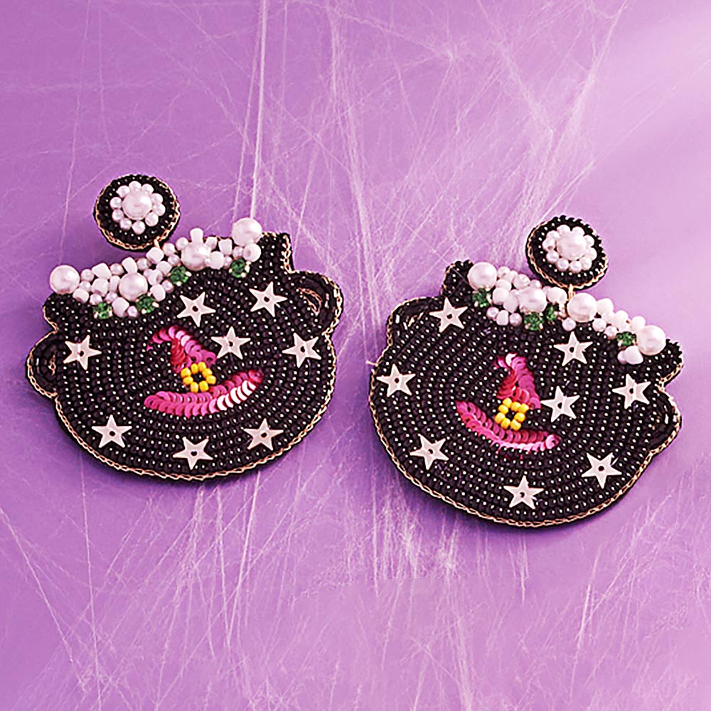 Pearl Star Sequin Seed Beaded Felt Back Halloween Witch Cauldron Earrings