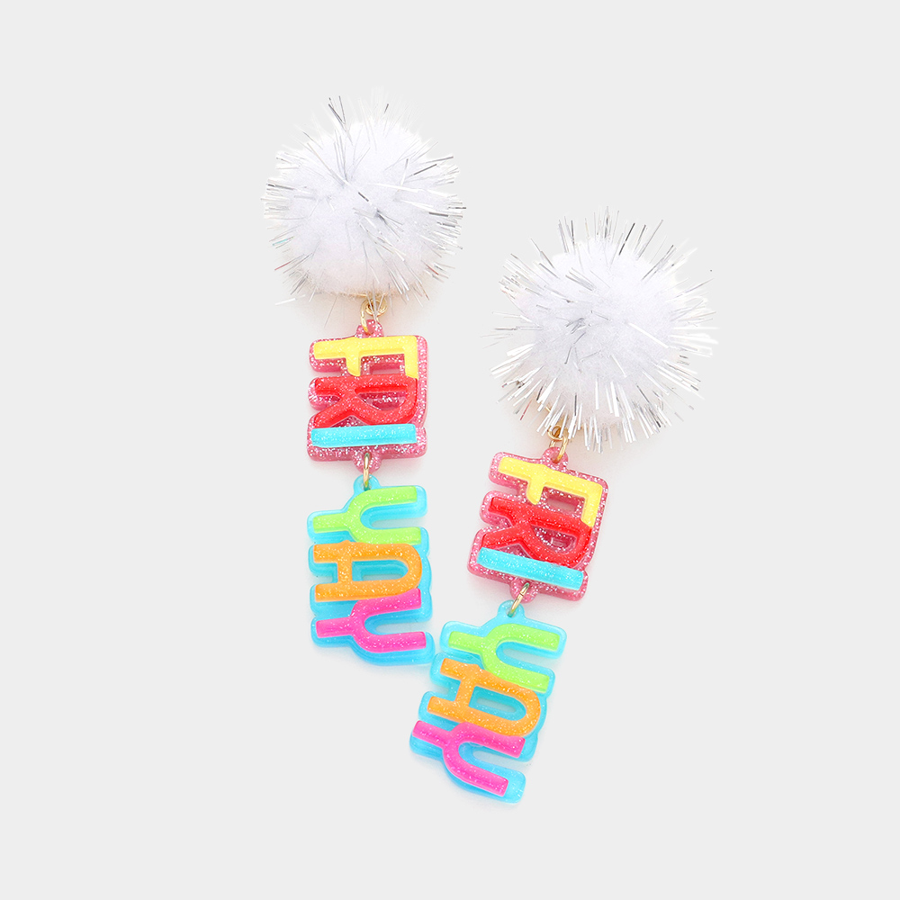 Pom Pom Glittered Resin Friyay Message Link Dangle Earrings