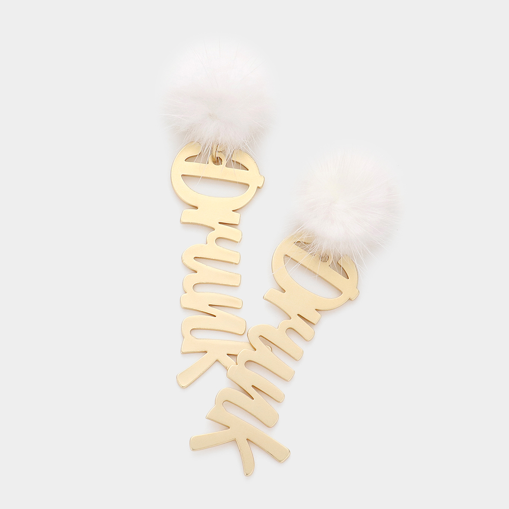 Pom Pom Metal Drunk Message Link Dangle Earrings