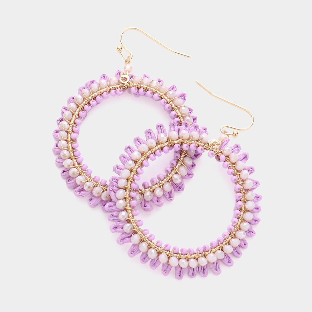 Raffia Faceted Bead Trimmed Open Circle Dangle Earrings