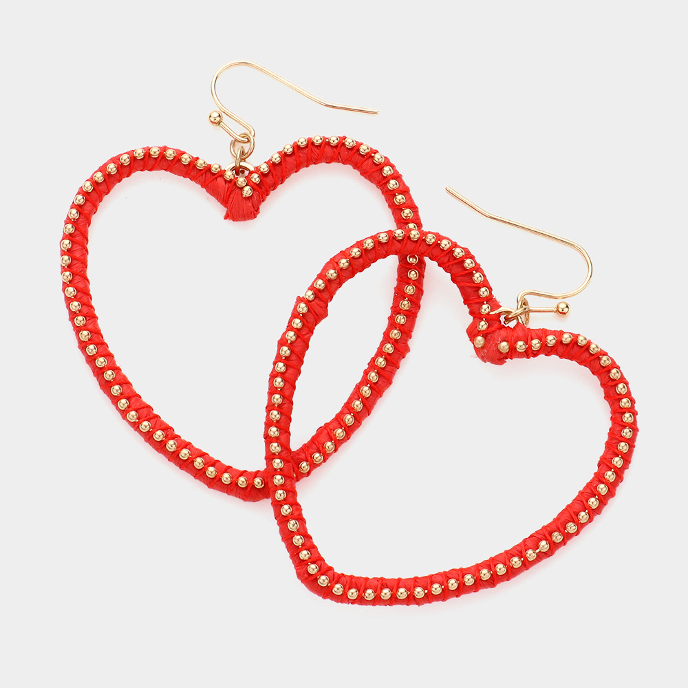 Raffia Metal Ball Wrapped Open Heart Dangle Earrings