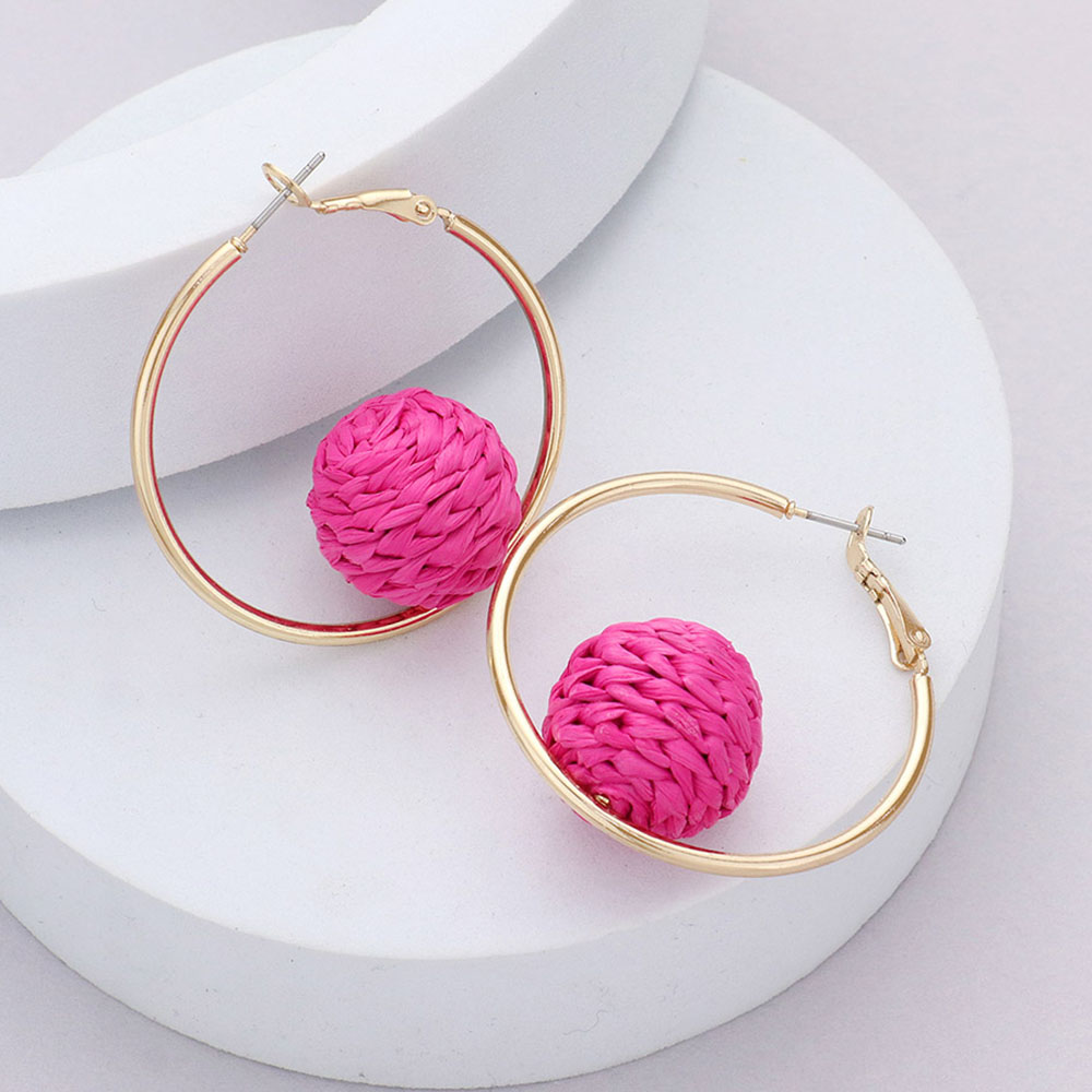Raffia Wrapped Ball Pointed Metal Hoop Earrings