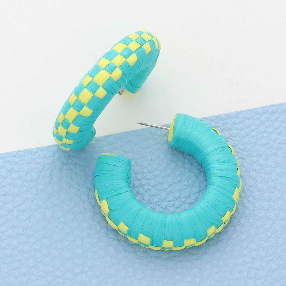 Raffia Wrapped Checkerboard Pattern Hoop Earrings