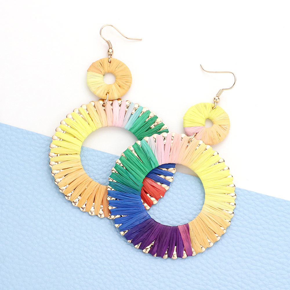 Raffia Wrapped Double Open Circle Link Dangle Earrings