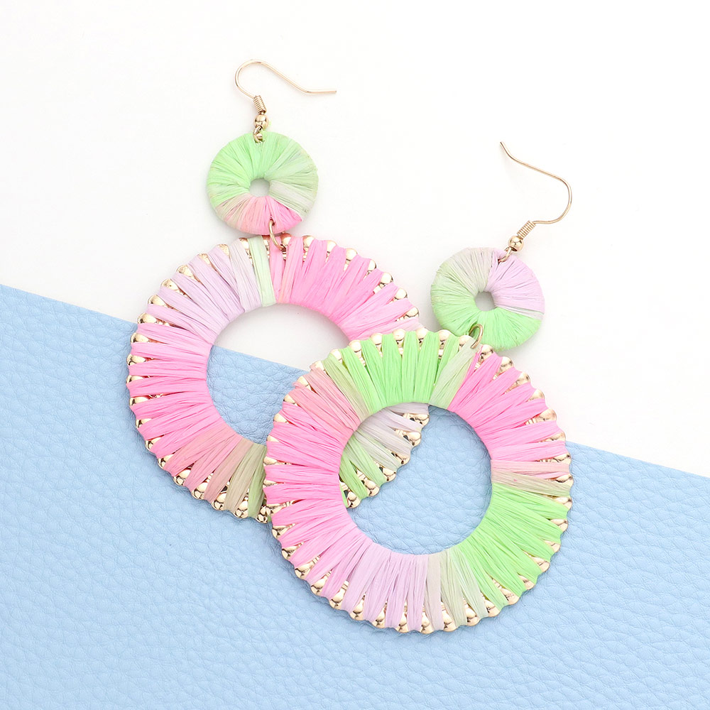 Raffia Wrapped Double Open Circle Link Dangle Earrings