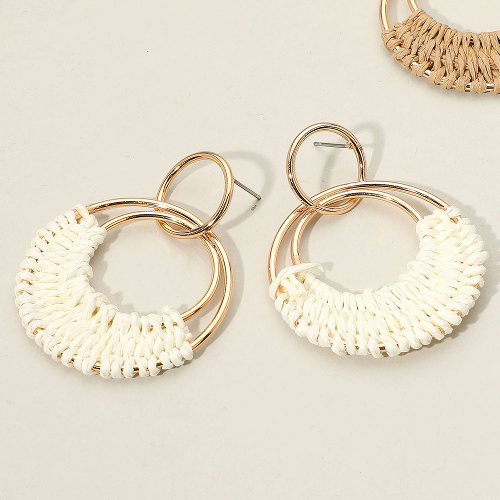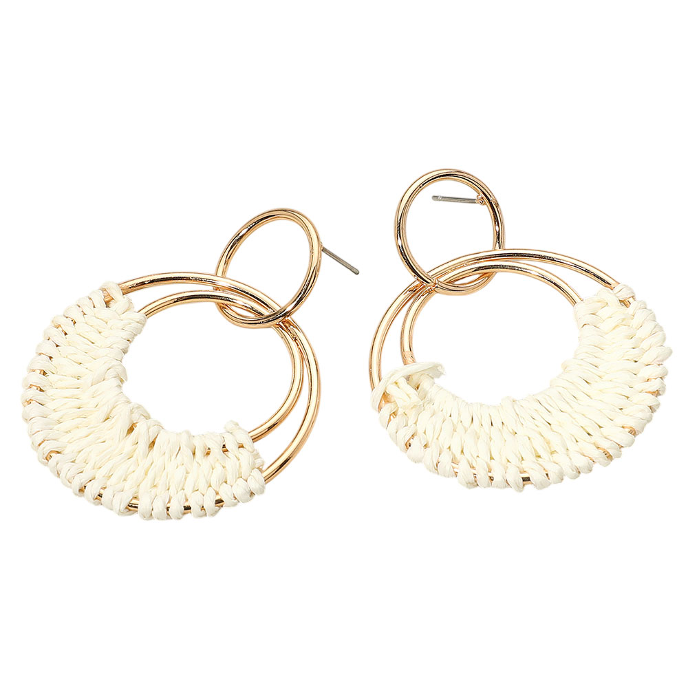 Details • Size : 1.5" X 2.5" • Post Back • Fun and stylish hoop earrings featuring woven thread accents and double gold rings. Lightweight and bold, perfect for summer outfits, casual wear, or adding flair to your everyday style. • Lead and Nickel Compliant